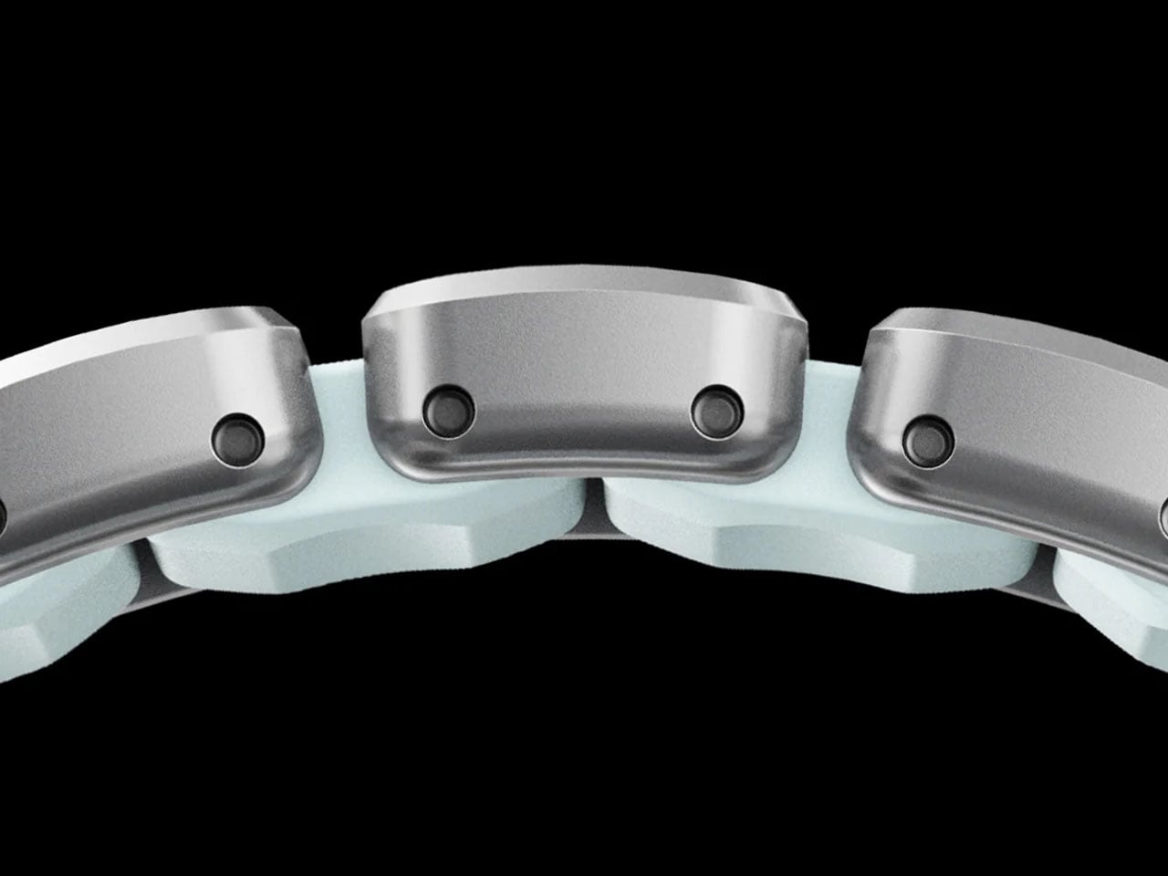 The new Stratos Band blends Grade 4 titanium hardware with compression-molded FKM fluoroelastomer for a hybrid design that balances strength and flexibility. The titanium outer links provide a refined look and robust build, while the FKM interior links contour around the wrist for comfort and movement that traditional metal bands rarely offer. This dual-material approach also introduces subtle ventilation spaces, which help with moisture evaporation and breathability during everyday wear or more intense activity.