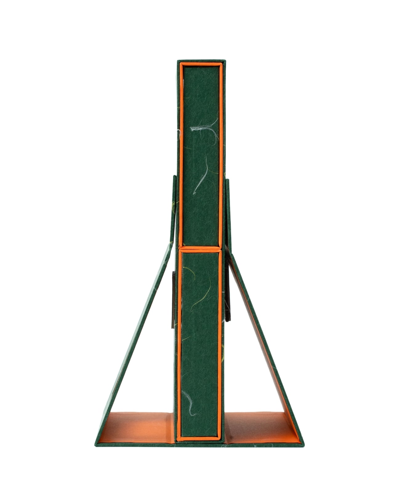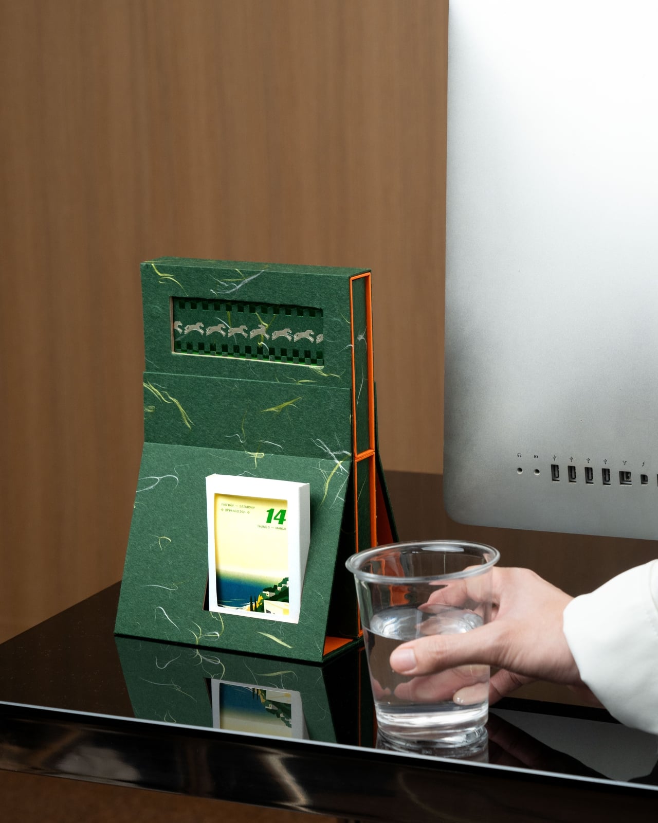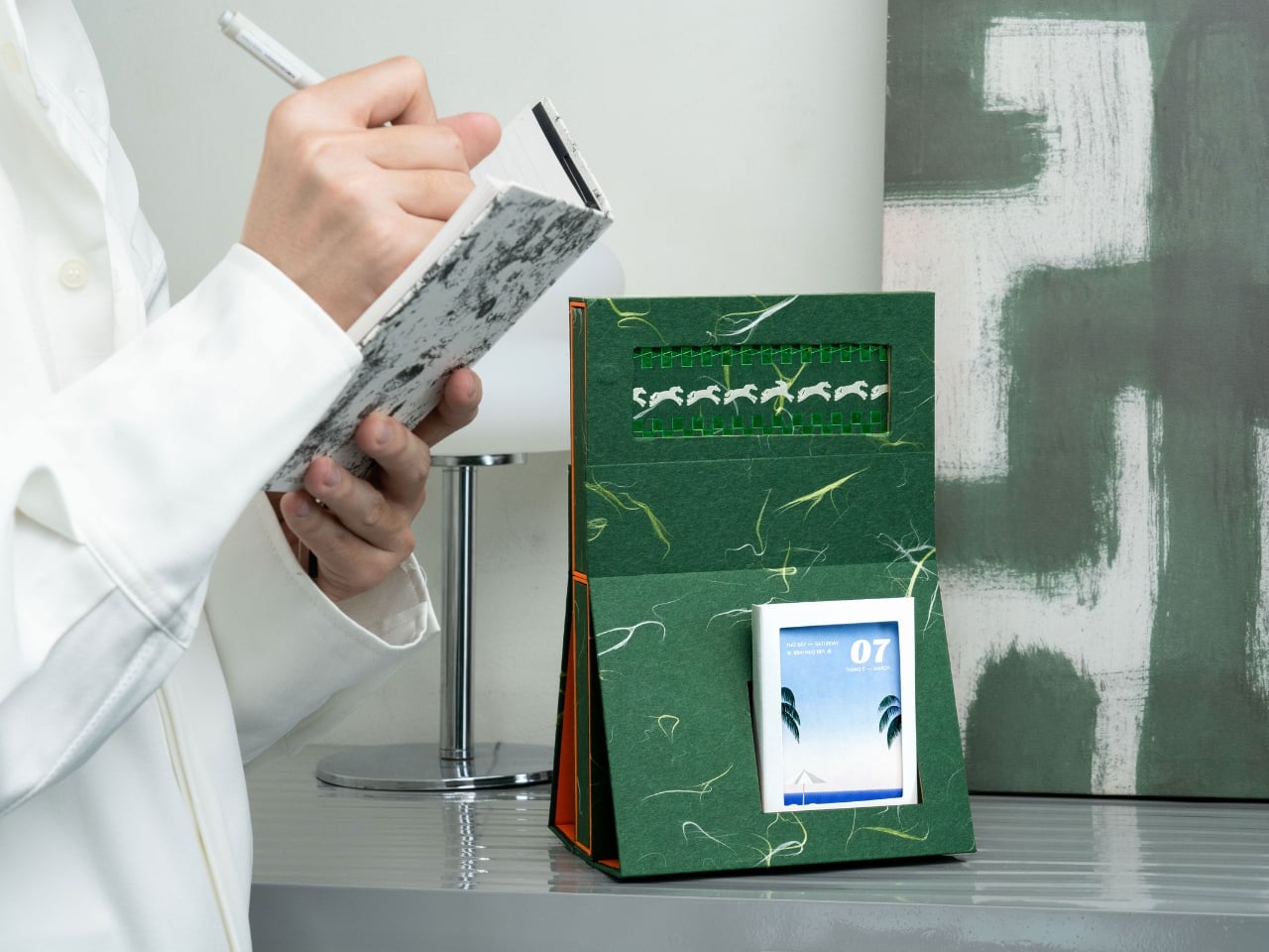 What really catches your eye is the material choice. The entire exterior is wrapped in this gorgeous deep green marbled paper with veins of gold running through it like captured lightning. It’s the kind of surface that makes you want to reach out and touch it, to trace those organic patterns with your fingertips. The marbling has a luxurious, almost geological quality, as if each calendar was carved from a block of precious stone rather than assembled from paper and cardboard.