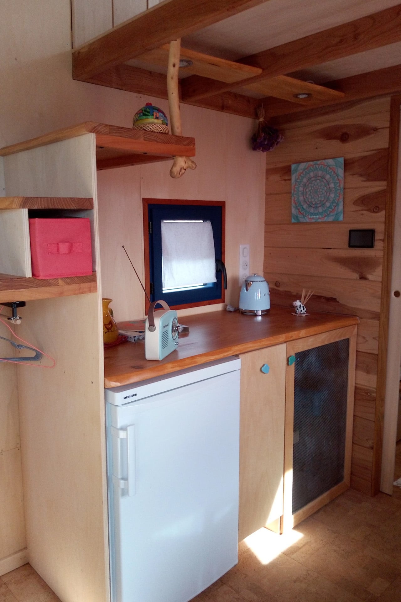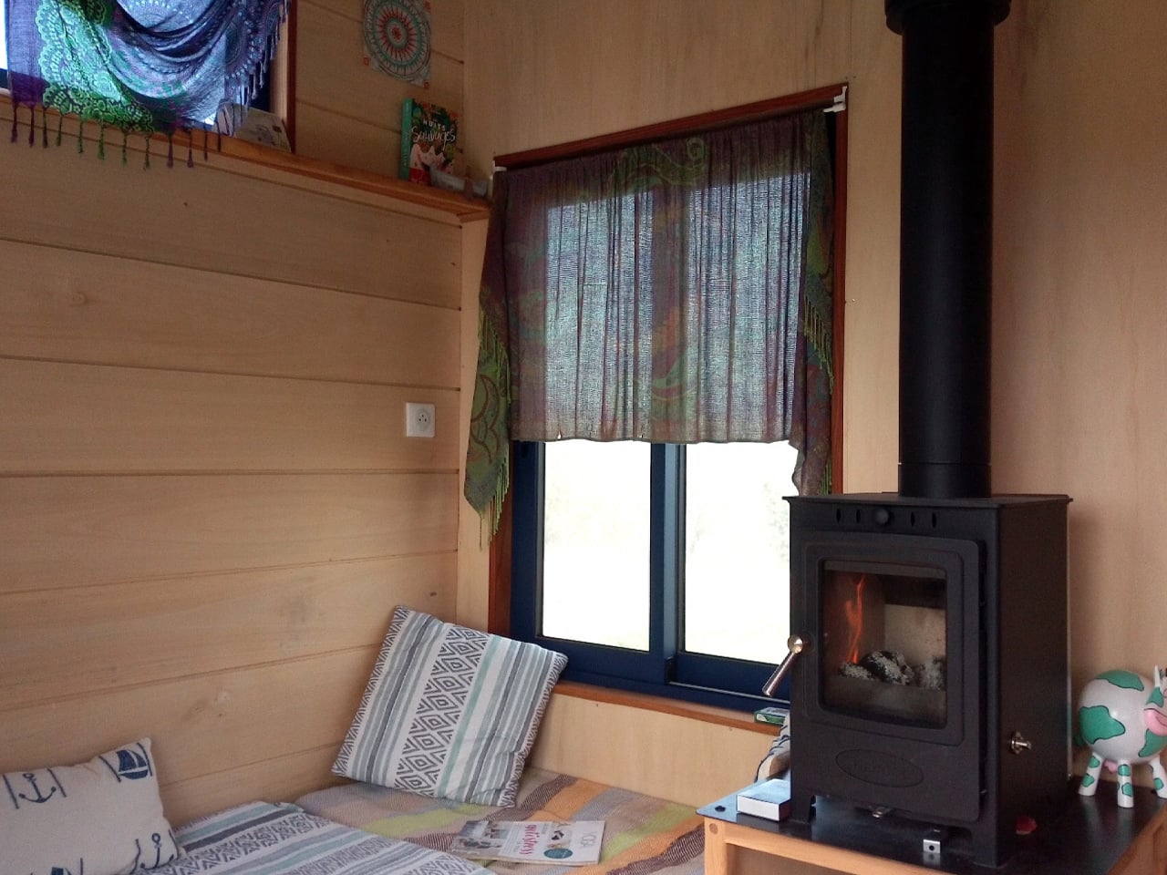 Inside, Ghislaine’s personality takes center stage. The space bursts with color, patterns, and a bohemian vibe that feels lived-in rather than designed. Wood finishes run throughout, creating continuity while the decor keeps things interesting. The layout sticks to the classic tiny house formula: a loft bedroom up top, reached by stairs that double as storage cubbies, a living area with a storage-integrated sofa, and a wood-burning stove for heat.