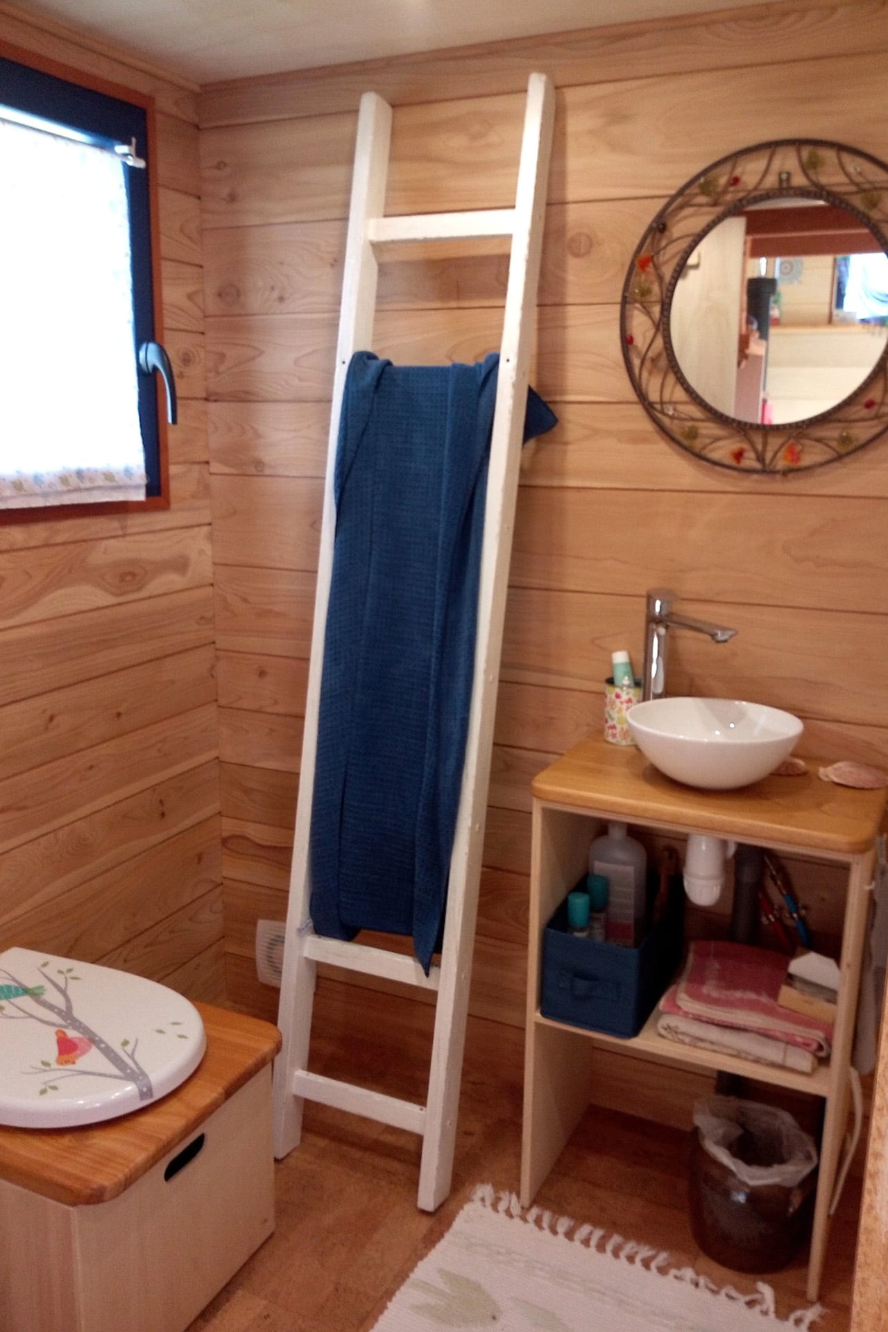 What makes Tiny Birdy genuinely independent is its off-grid setup. Solar panels power everything, while a water filtration system handles clean water needs. The waterless toilet eliminates plumbing complications, and a hybrid gas/electric water heater means hot showers are always available, rain or shine. These aren’t just eco-friendly choices; they’re practical ones that give Ghislaine the freedom to park wherever she wants.