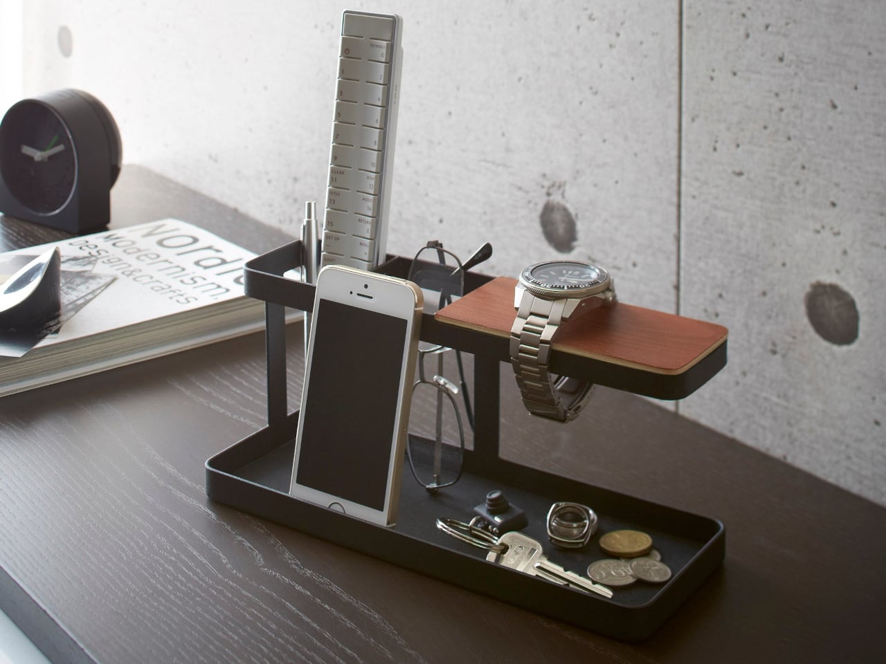 Yamazaki’s Tower Desk Organizer is a compact steel and wood bar that behaves more like a miniature piece of furniture than a generic tray. It has a slim base tray divided into two zones, a vertical post, and a raised wooden rest for watches or bracelets, all within a footprint that fits between a keyboard and monitor or next to a sofa arm.