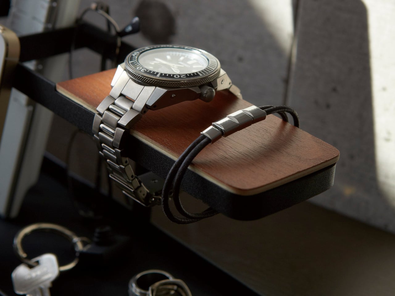 By evening, the same organizer moves to a living room table, where it now holds a couple of remotes, reading glasses, and a phone while you watch something or read. The two compartments make it easy to separate tech from analog items, so you are not fishing for a remote under a pile of keys. The watch bar doubles as a small display for a bracelet or everyday watch when you are off the clock.