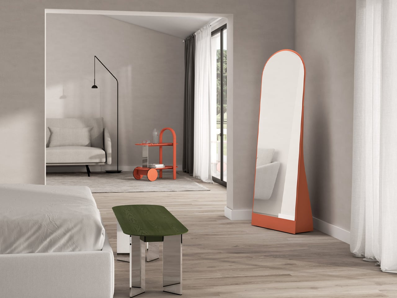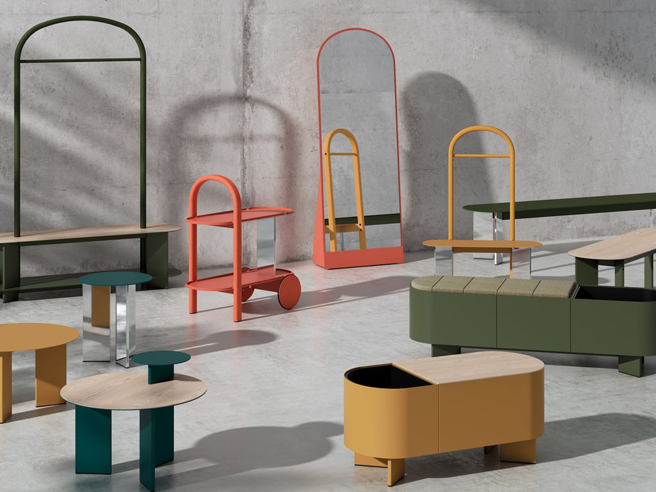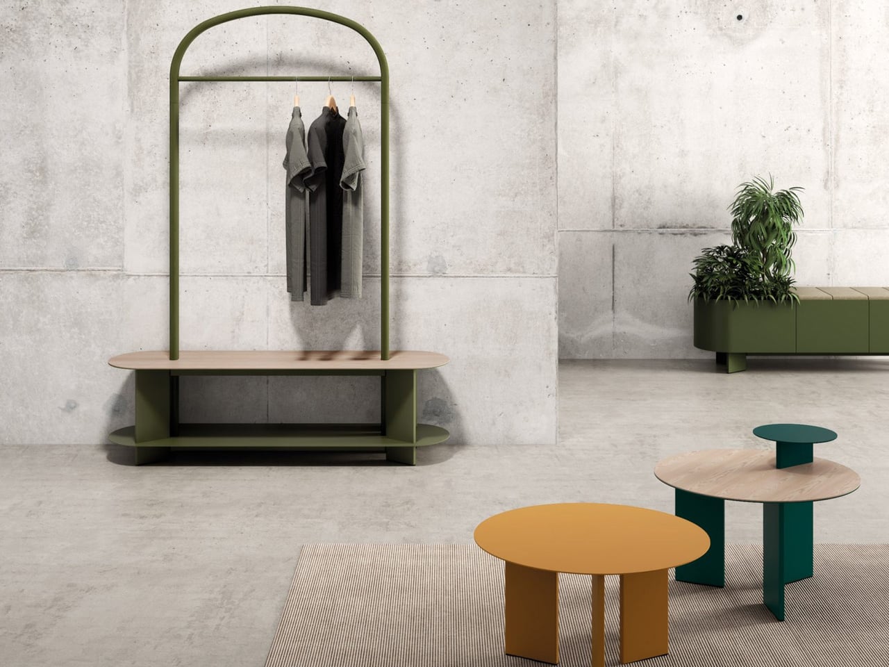 Designed by Lagranja Design for Systemtronic, the Croma furniture collection is defined by consistent curved lines and warm-toned finishes inspired by Mediterranean materials. Natural and stained ash wood is combined with painted and chrome-plated aluminium to create contrast while maintaining visual softness. The collection includes arched wardrobes, rounded planter benches, circular tables in multiple sizes, mirrors, valet stands, and trolleys. Unified geometry across all pieces ensures compatibility within shared spaces, allowing the collection to function as a coordinated system rather than isolated objects.