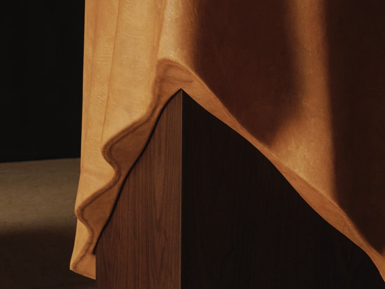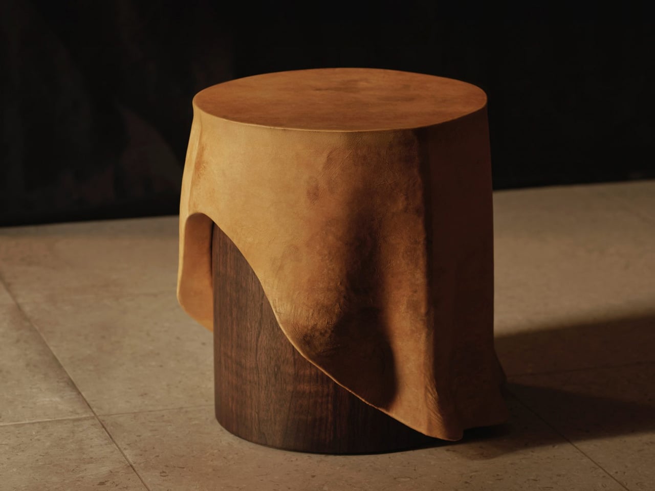 Studio TOOJ’s Duk furniture series explores how mycelium-based materials can transform the surface and perception of solid furniture. Each piece is formed from sculpted wood and finished with Reishi, a biomaterial developed by MycoWorks from mushroom root structures. This layered construction allows rigid forms to visually resemble soft, draped fabric while maintaining structural stability. The mycelium surface introduces organic texture and matte softness, creating a textile-like appearance without using traditional upholstery or leather.