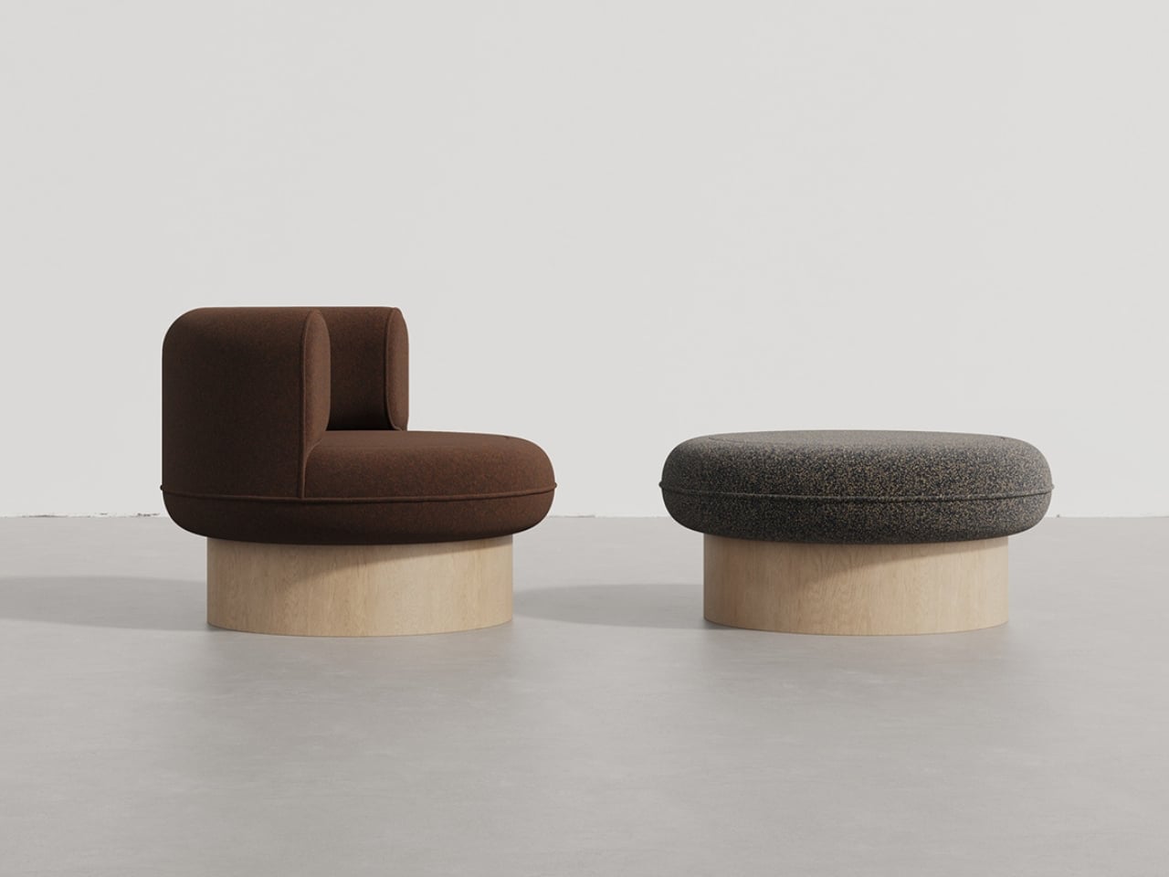 The SOLO furniture collection by Mudu Studios is a seating concept that balances visual refinement and thermal comfort with ergonomic comfort. The range includes an armchair, sofa, and pouf, all characterised by generously cushioned upholstery set on raised bases made from metal or natural veneer. This pedestal-style structure visually lifts the soft seating volumes, creating a strong contrast between plush textiles and solid foundations. Accent stitching adds subtle definition to the upholstery, reinforcing form while enhancing durability and finish quality.