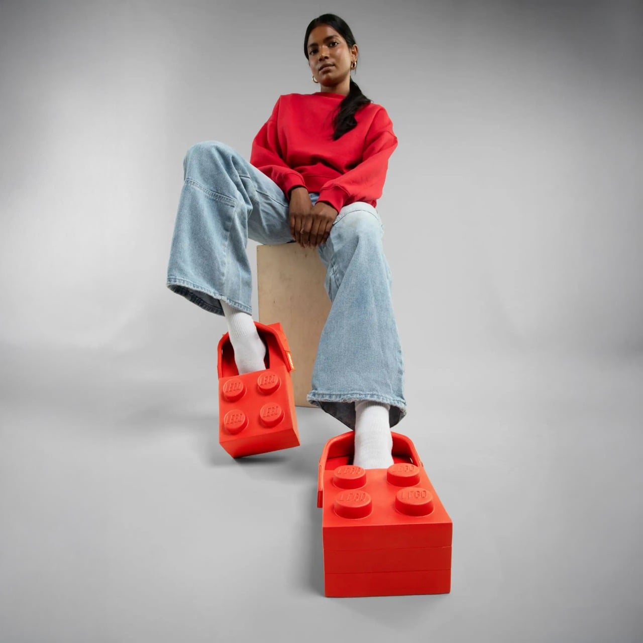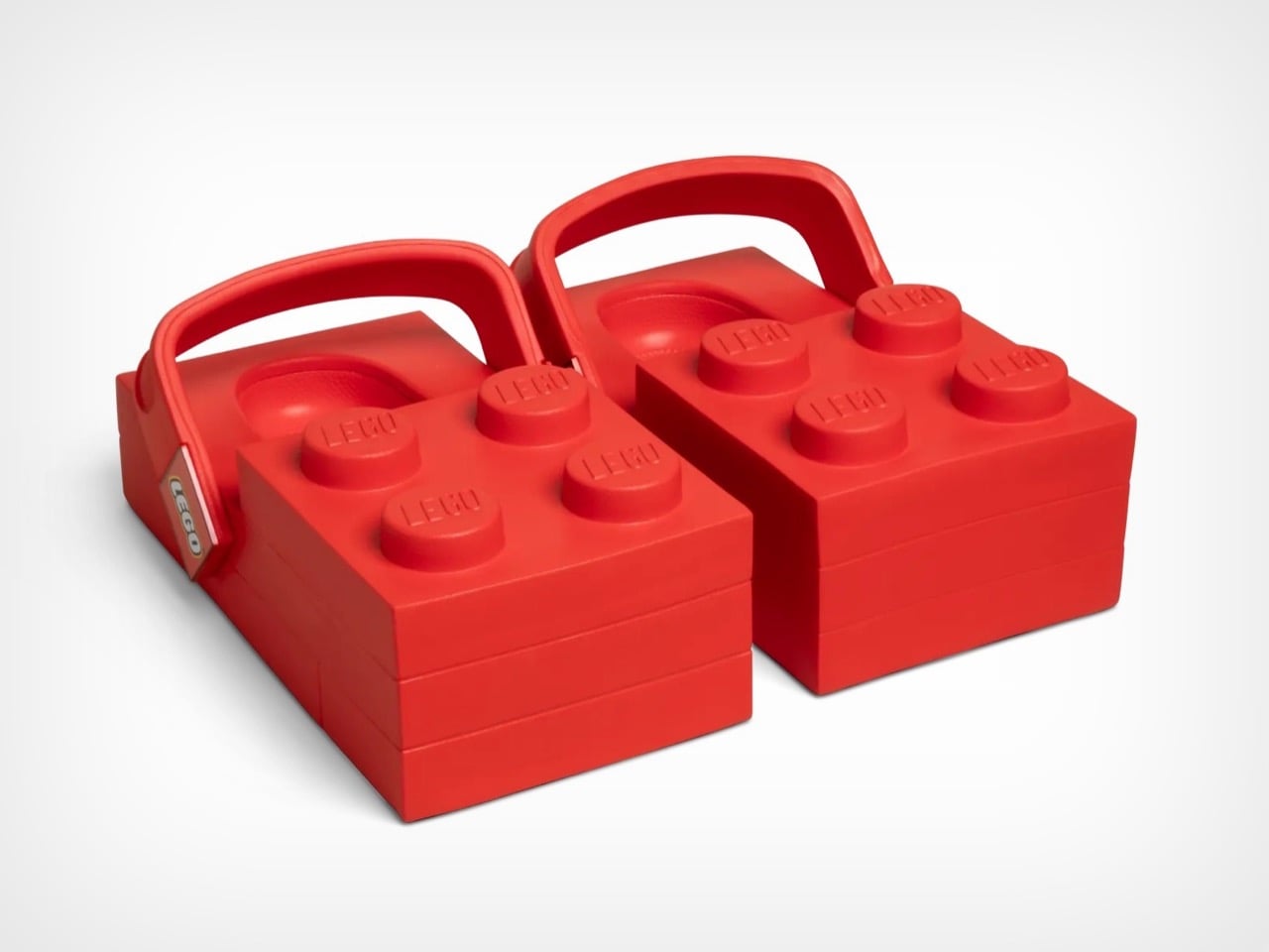 The LEGO Brick Clogs are not subtle. They are not refined. They are giant red rectangles that you strap to your feet, complete with four oversized studs jutting from the top like a toddler’s building block scaled up for adult wear. This is footwear that makes no apologies for its absurdity. Your feet disappear entirely into chunky brick shapes that add inches of height and pounds of visual weight, transforming your lower legs into what looks like a sight gag from a cartoon.