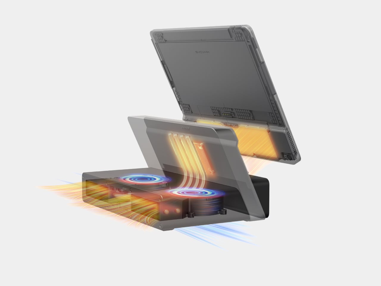 The Mind Go Stand is where the device stops pretending to be just a tablet. The stand adds active cooling and a full set of ports, USB-C, HDMI, USB-A, Ethernet, headphone jack, plus integrated speakers. With sustained cooling, Mind Go can push up to about 30 W of performance, roughly double its tablet mode, and suddenly the small screen is driving multiple external displays and heavier workloads.