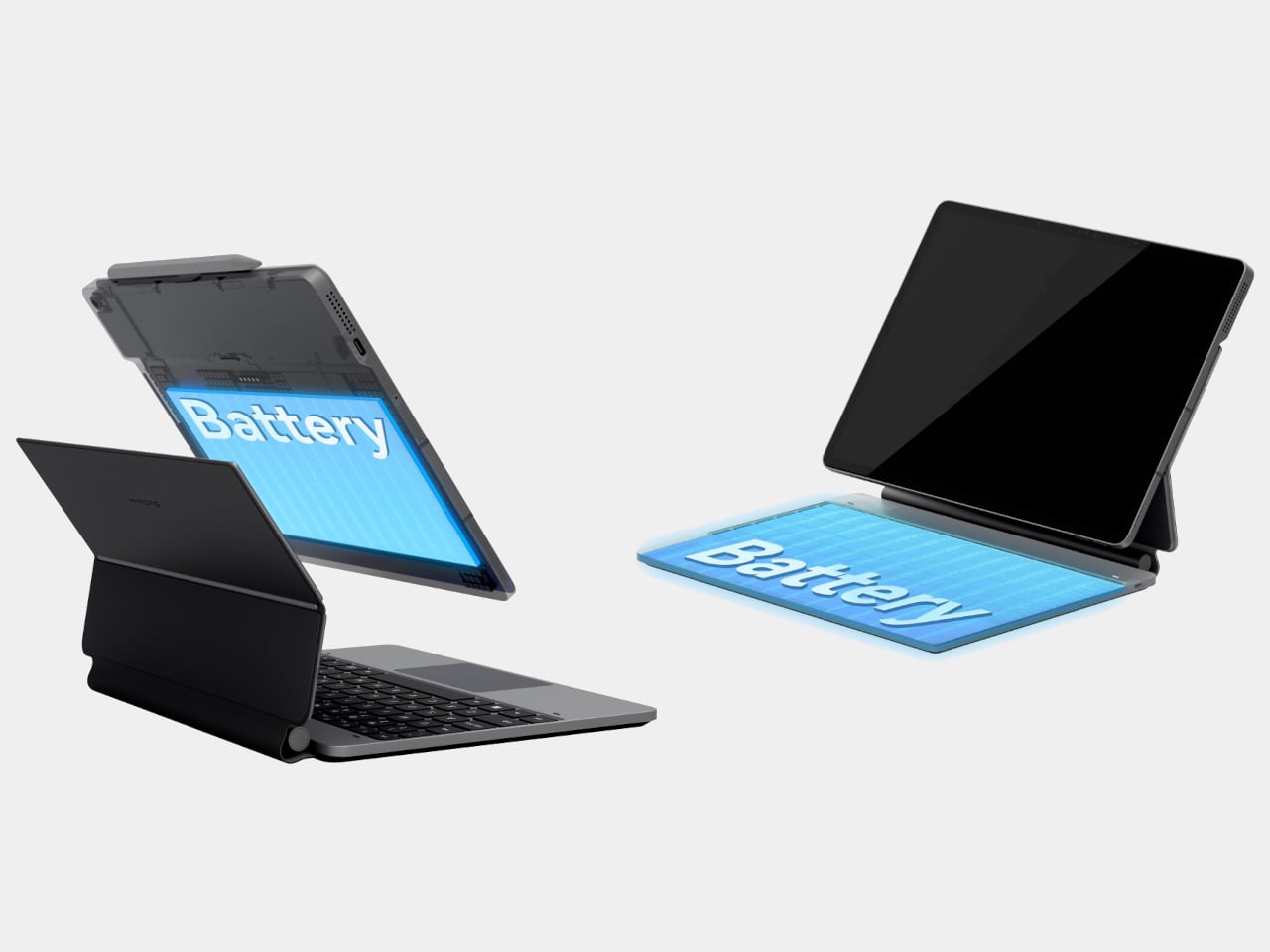 At a desk or café, the tablet drops into the Mind Go Keyboard. The keyboard is both input and battery, connected through pogo pins, bringing total capacity to 45Wh and roughly nine hours of local video playback. The trackpad and full keys turn the setup into a familiar laptop, and you can detach or reattach the tablet without interrupting what you are doing, shifting between seated and walk-around work.