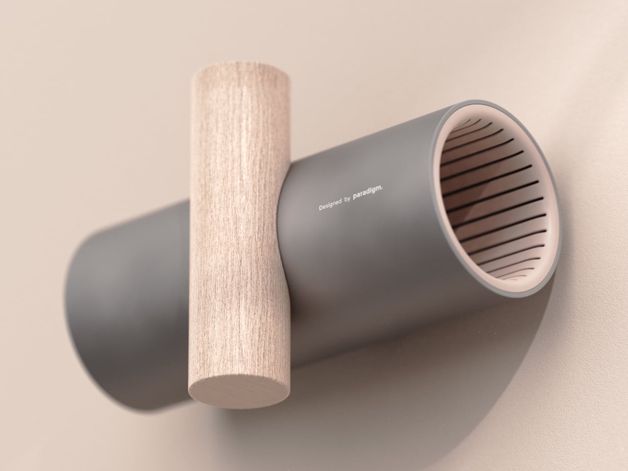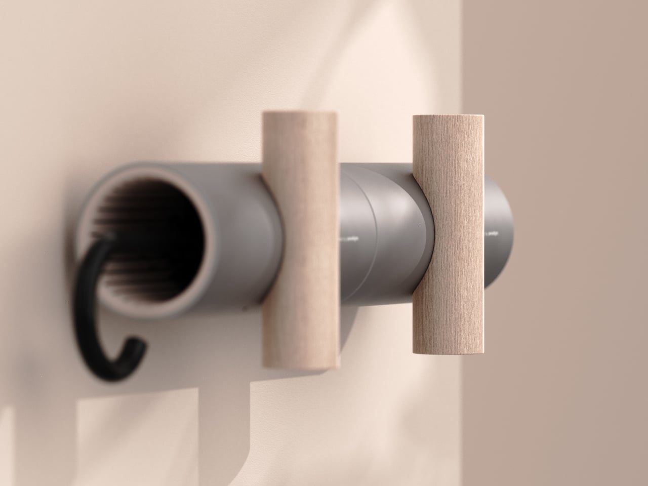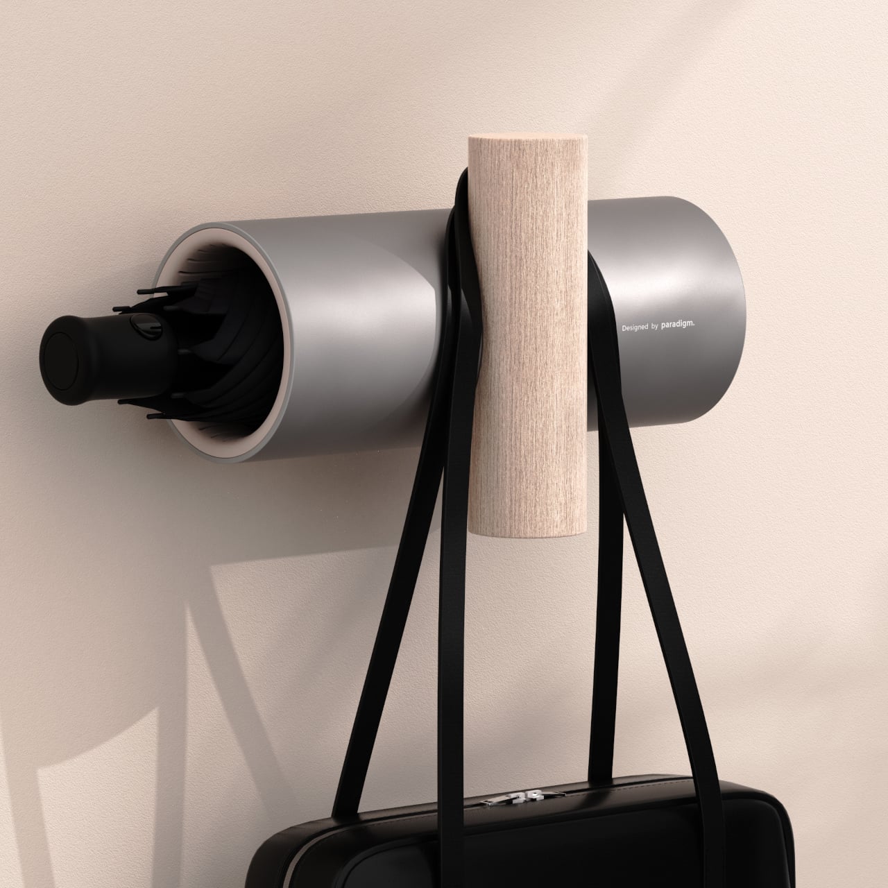 UMBRELLA+ is a concept that revisits the umbrella stand by moving it onto the wall. It is a horizontal cylinder that receives the folded umbrella, intersected by a vertical wooden element that acts as a hook for bags or coats. The T-shaped gesture pulls the umbrella into your field of view at entry height, merging storage and hanging into one coherent system.