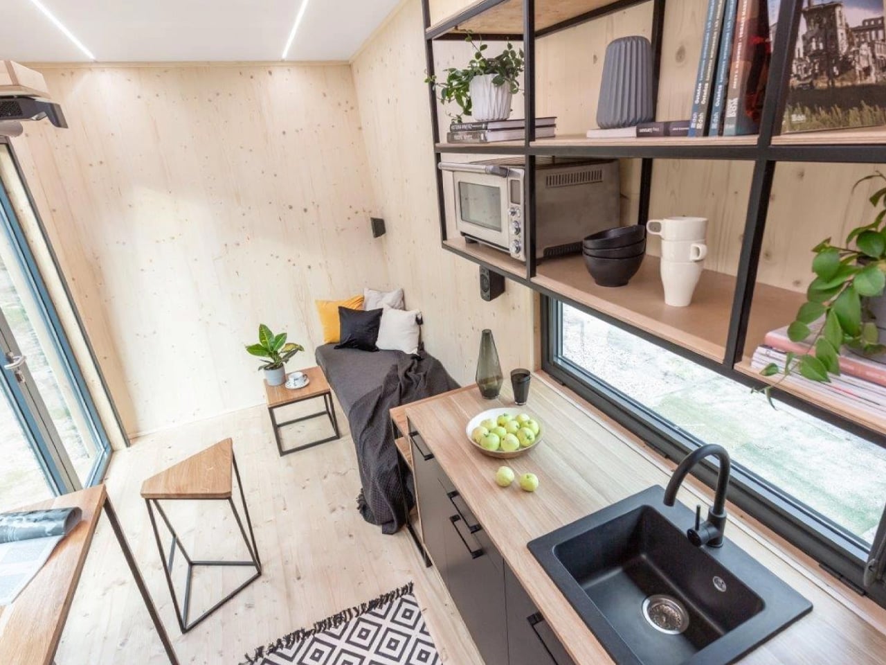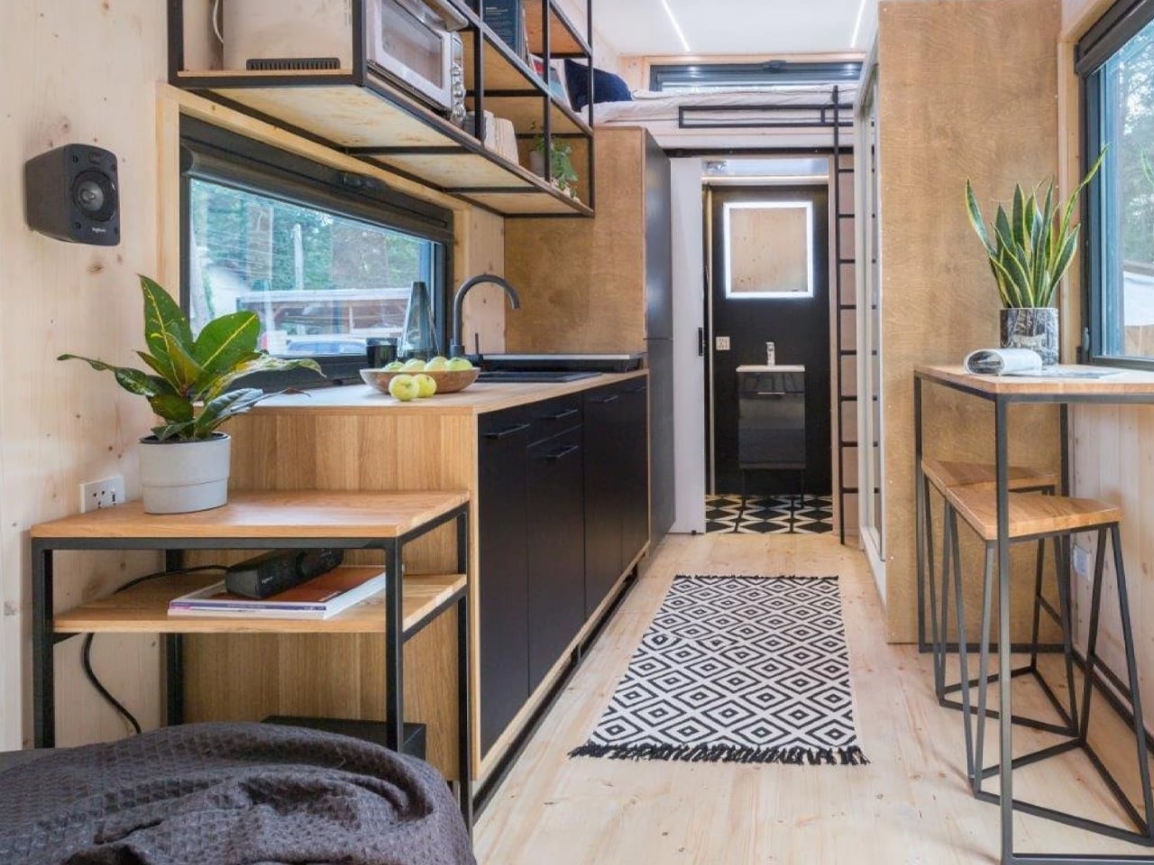 Step inside, and you’ll discover an unexpected contrast to the menacing exterior. The interior spaces showcase beautiful spruce wood throughout, creating warmth and organic texture that immediately softens the industrial vibe. Large windows punctuate the walls, flooding the compact floor plan with natural light and preventing any sense of claustrophobia. This juxtaposition between dark and light, industrial and natural, demonstrates sophisticated design thinking that elevates the Dark Vader beyond novelty status into genuine architectural achievement.