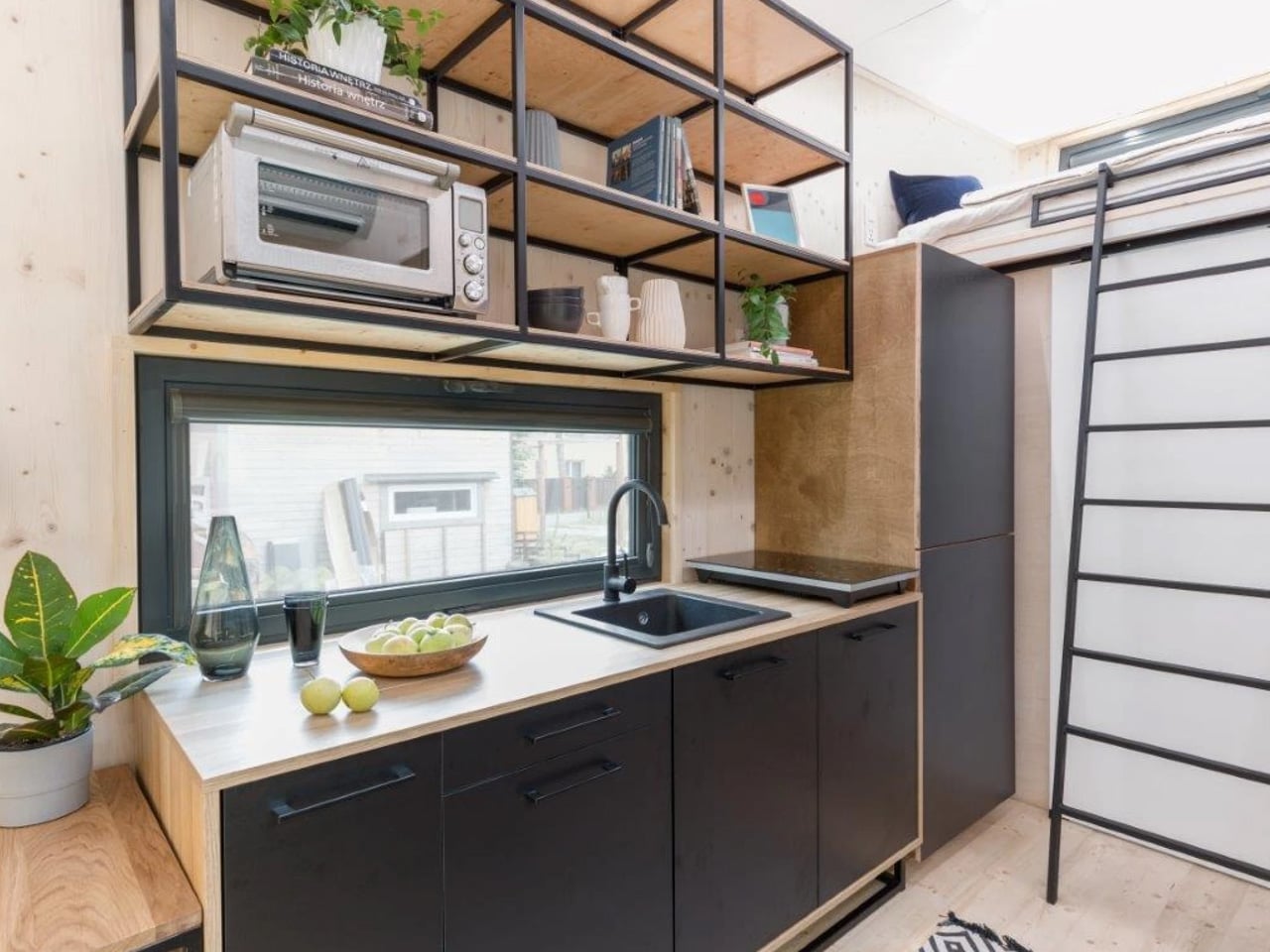 The exterior is where this tiny home truly makes its statement. Wrapped entirely in black sheet metal, the Dark Vader creates an imposing silhouette that stands in stark contrast to the cheerful pastels and natural wood tones dominating most tiny house communities. This bold material choice isn’t just about aesthetics; the metal cladding provides durability and weather resistance while maintaining that distinctive edge. Mounted on a double-axle trailer foundation, the structure spans six meters, which translates to roughly twenty feet of living space. While this dimension might seem modest, especially when compared to the forty-foot behemoths common across North America, it represents the sweet spot for European tiny house design, balancing mobility with livability.