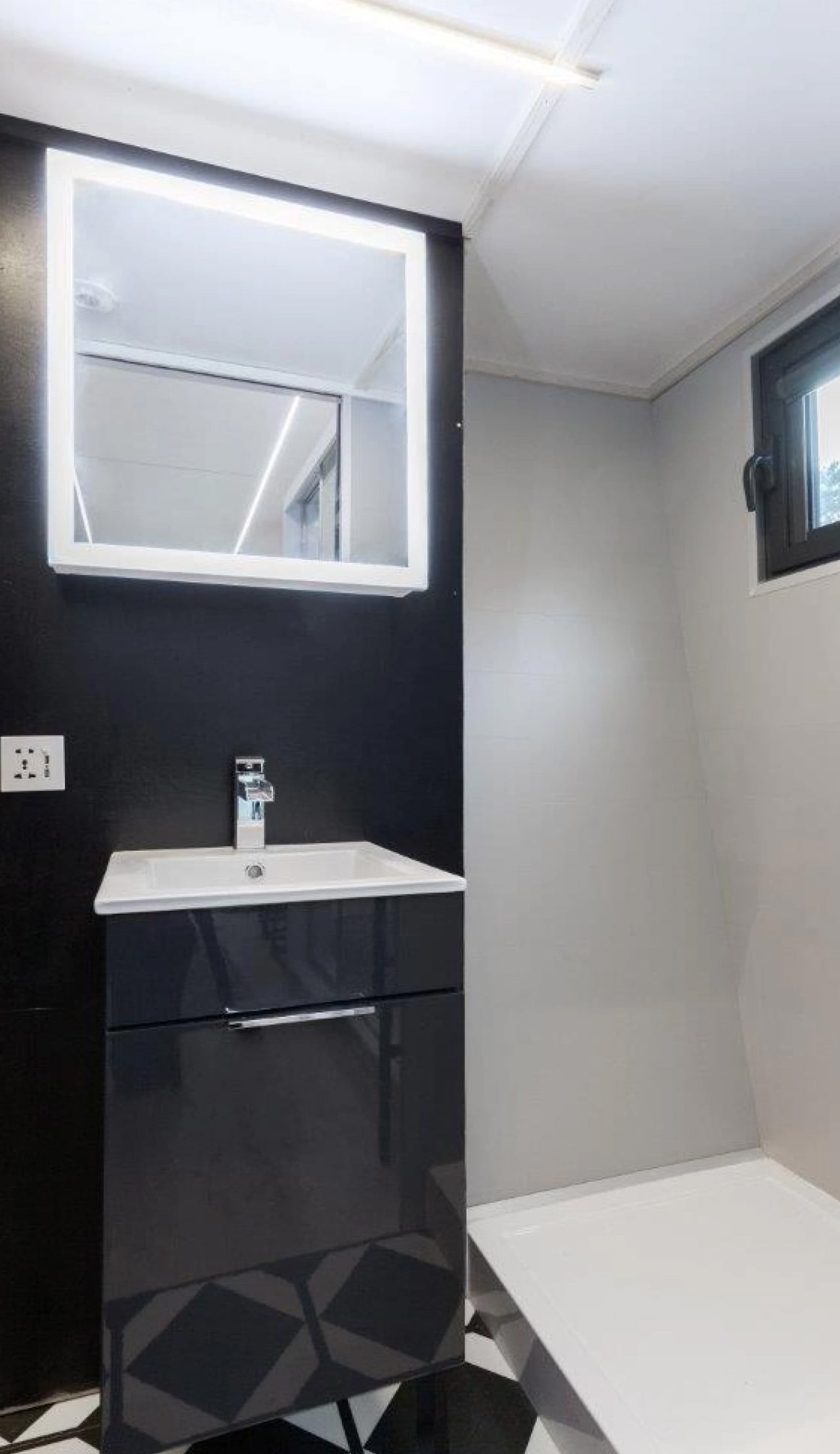 The main level houses the primary living spaces with impressive efficiency. A comfortable sofa anchors the living room alongside a petite coffee table, creating an intimate gathering spot perfect for unwinding after work or hosting friends for evening conversations. The kitchen area integrates seamlessly into the open layout, while the bathroom surprises with full-sized amenities including a proper walk-in shower, contemporary vanity sink, and standard flushing toilet. These features matter tremendously in tiny living, where many occupants struggle with composting toilets and cramped shower stalls.