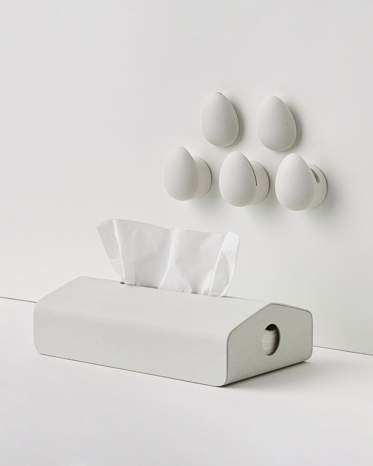 The birdhouse package transforms into a refillable tissue holder after you’ve unpacked everything. The circular opening on the side isn’t just aesthetic; it’s functional, letting you see at a glance when you’re running low. Made from vegan leather, it brings a soft contrast to the stone-like texture of the eggs. The eagle motif threading through both the eggs and the “nest” creates visual continuity that feels intentional rather than gimmicky.