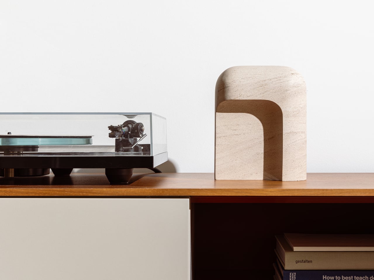 The wood versions, oak and walnut, bring warmth and visible grain to a shelf or sideboard. The stone versions, Portuguese limestone for subtlety and Guatemala marble for a stronger character, feel more like small monoliths anchoring a corner of the room. In each case, the material is chosen to sit comfortably among books, speakers, and other objects without shouting for attention or feeling like obvious “tech gear.”