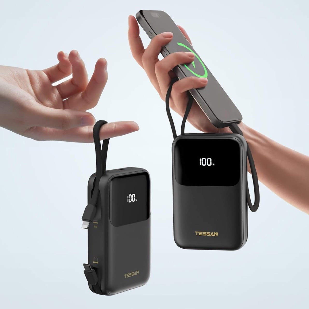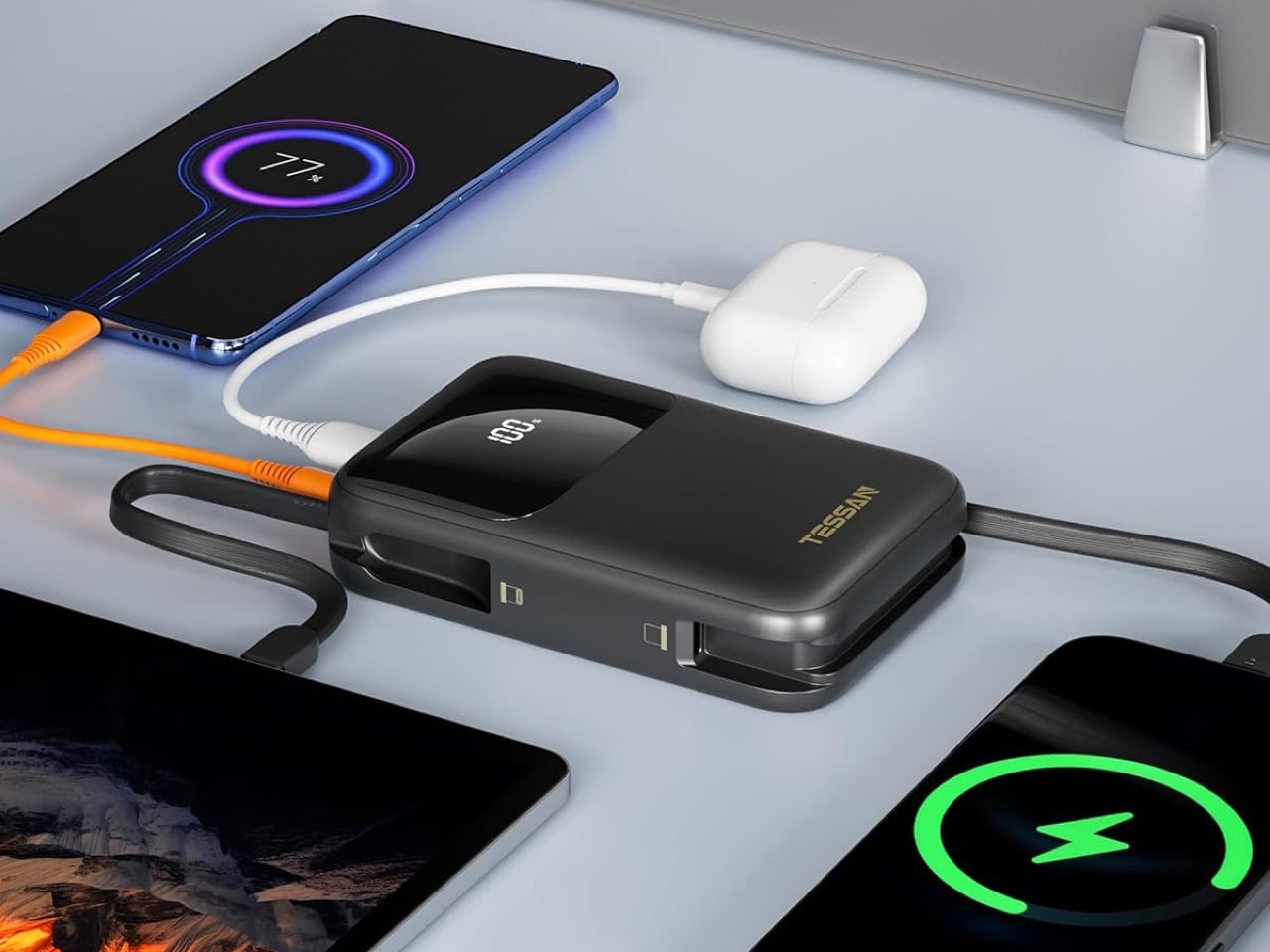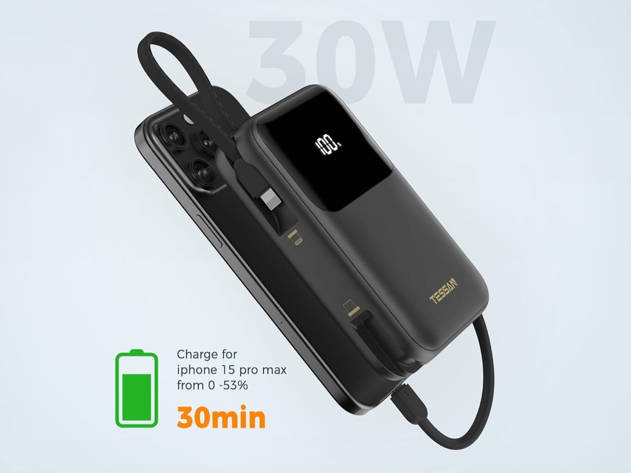 The built in cables are what make this thing actually useful instead of just another rectangular battery that sits in a drawer. You get a Lightning cable and a USB C cable permanently attached to the bank itself, plus a separate USB C port and USB A port on the side. So you can charge an iPhone, an Android phone, and something like a tablet or a laptop all at once without carrying a single extra cord. The 30 watt output means you can actually fast charge modern phones or keep a thin laptop limping along during a long meeting. TESSAN says it will push an iPhone 15 Pro to 53 percent in half an hour, which tracks with standard USB C PD speeds.