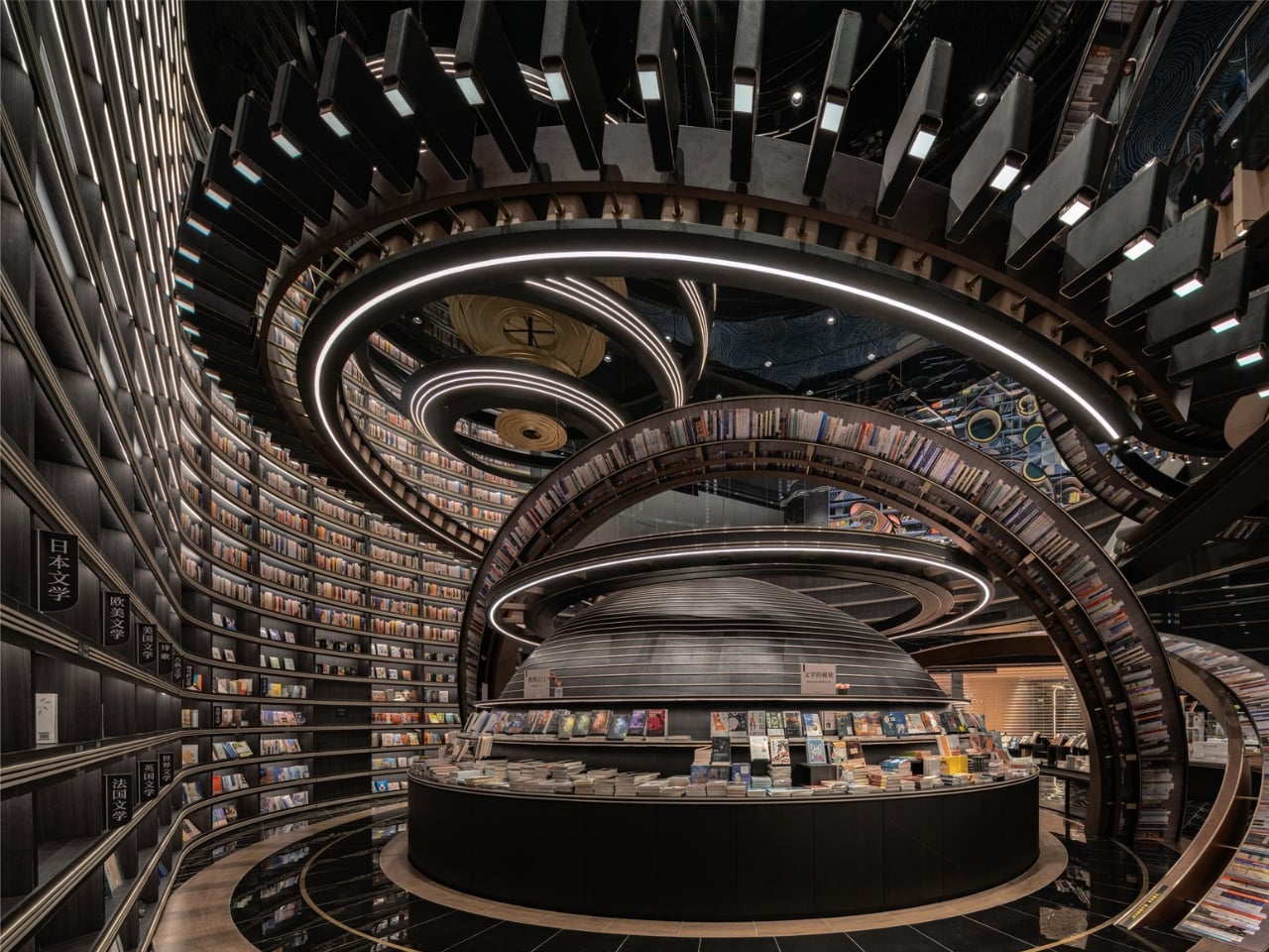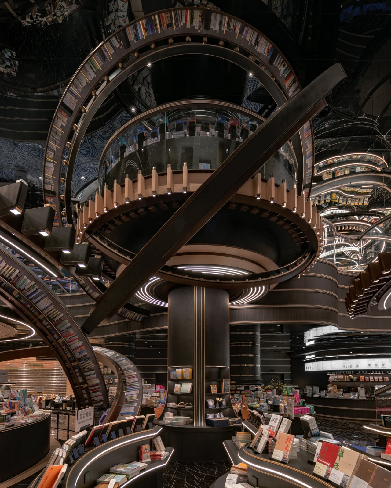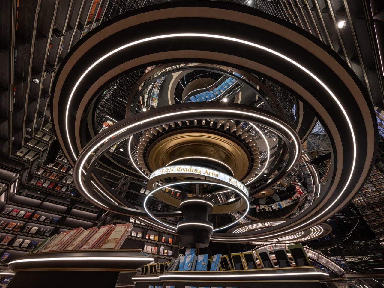 What makes this space so mind-blowing? It’s all about those massive three-dimensional structures that look like astronomical instruments floating inside the store. Imagine concentric rings and geometric forms inspired by celestial mechanics, all reimagined as bookshelves and display areas. The books themselves seem to defy gravity, positioned on these dramatic structures in ways that make you feel like you’re browsing a library floating somewhere in deep space.