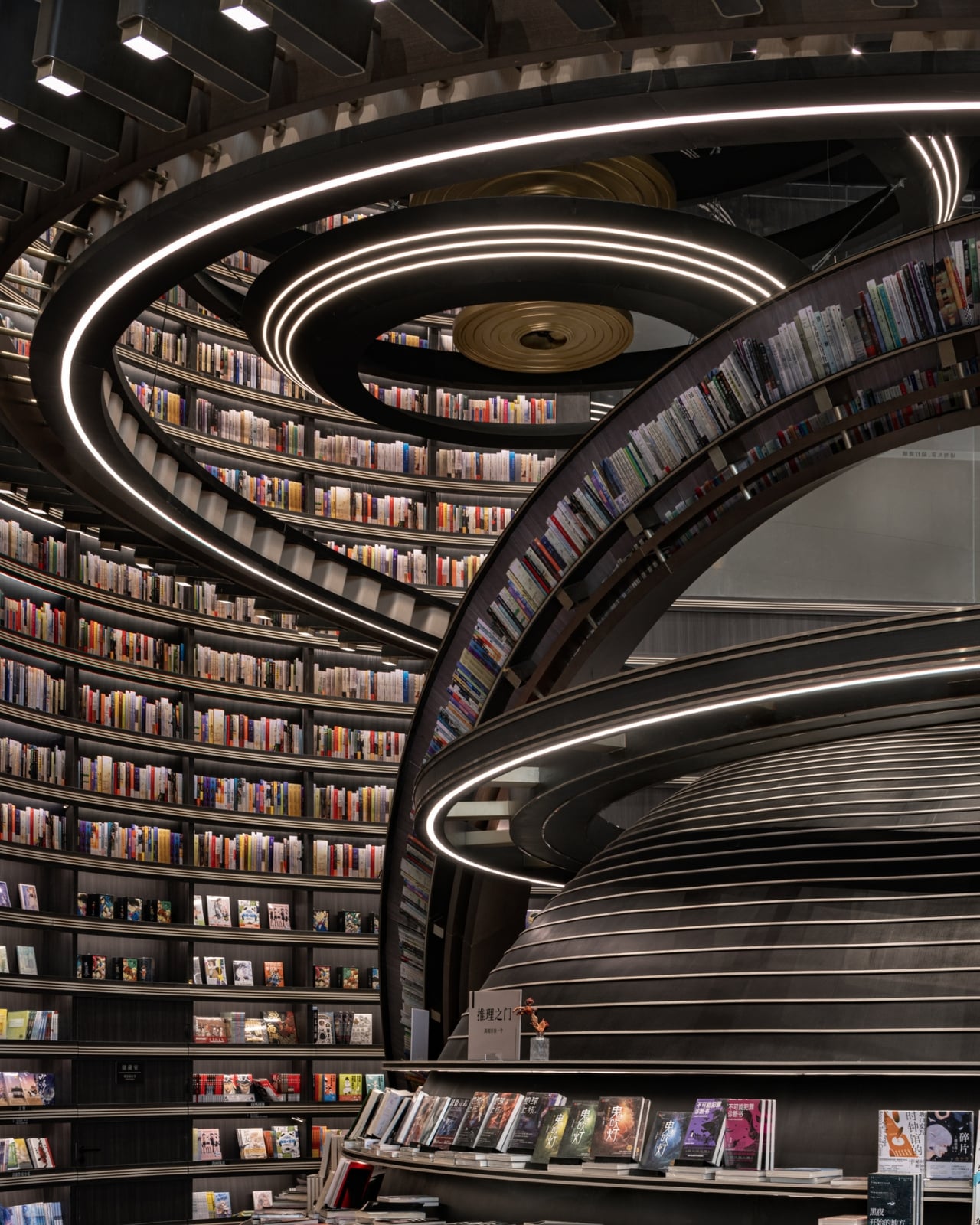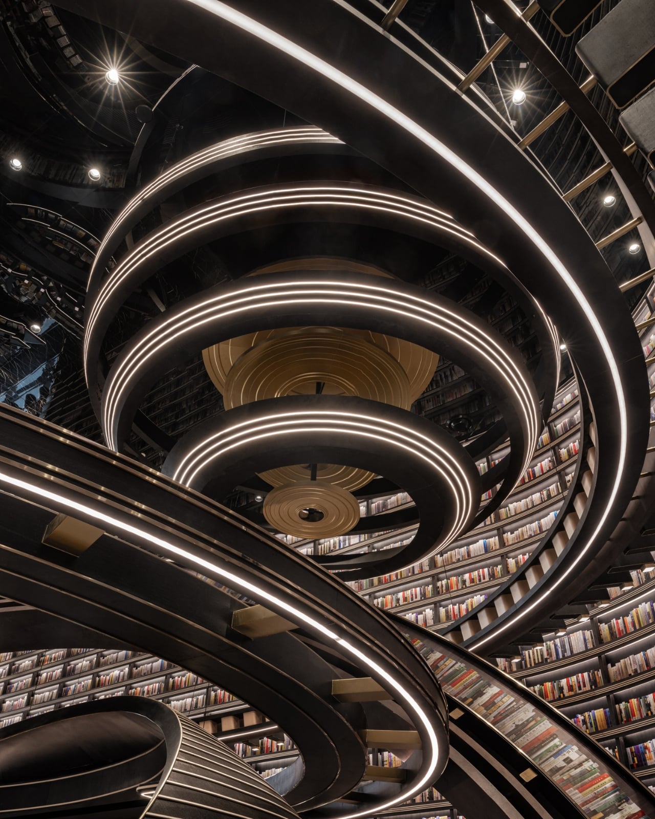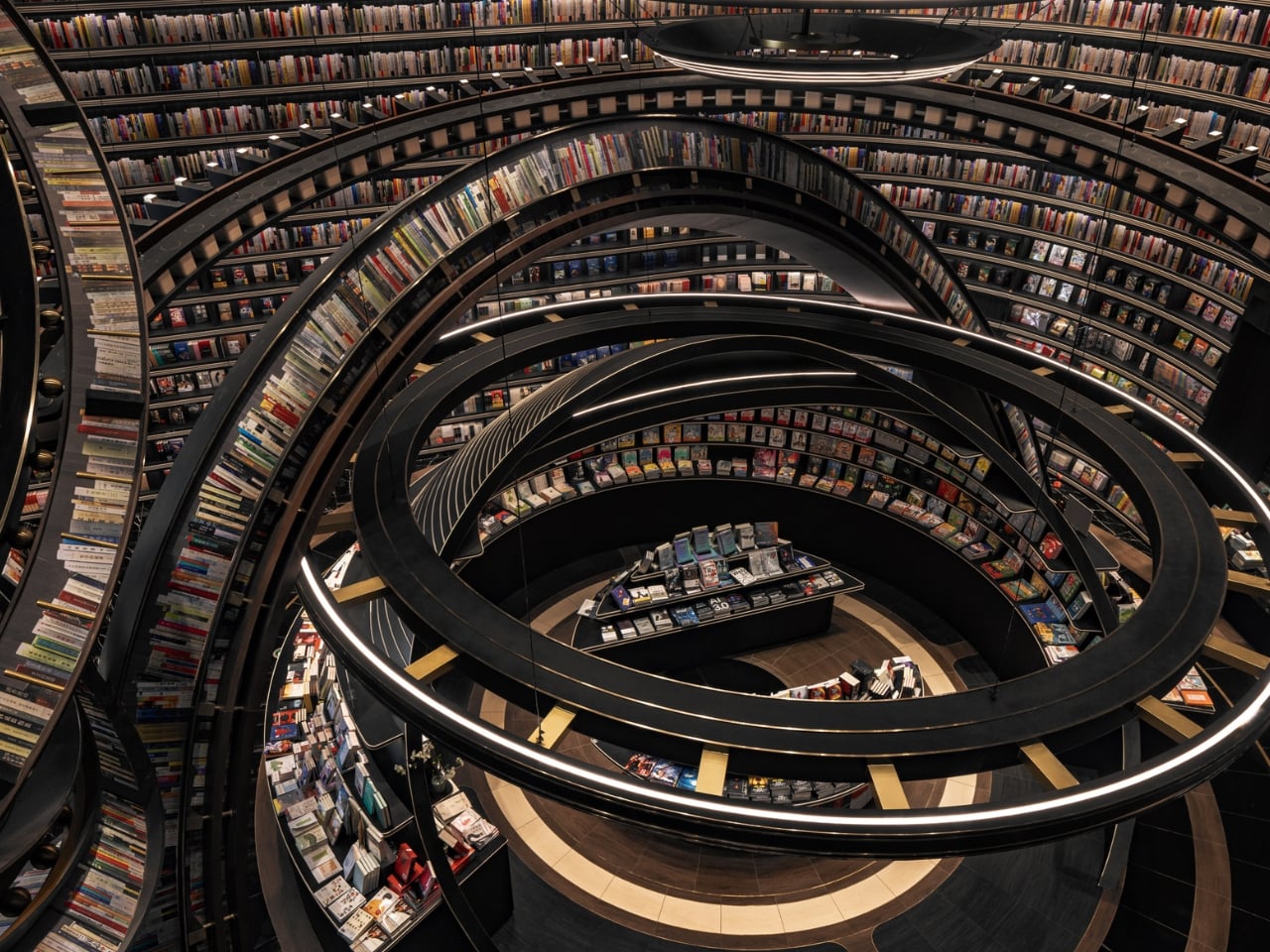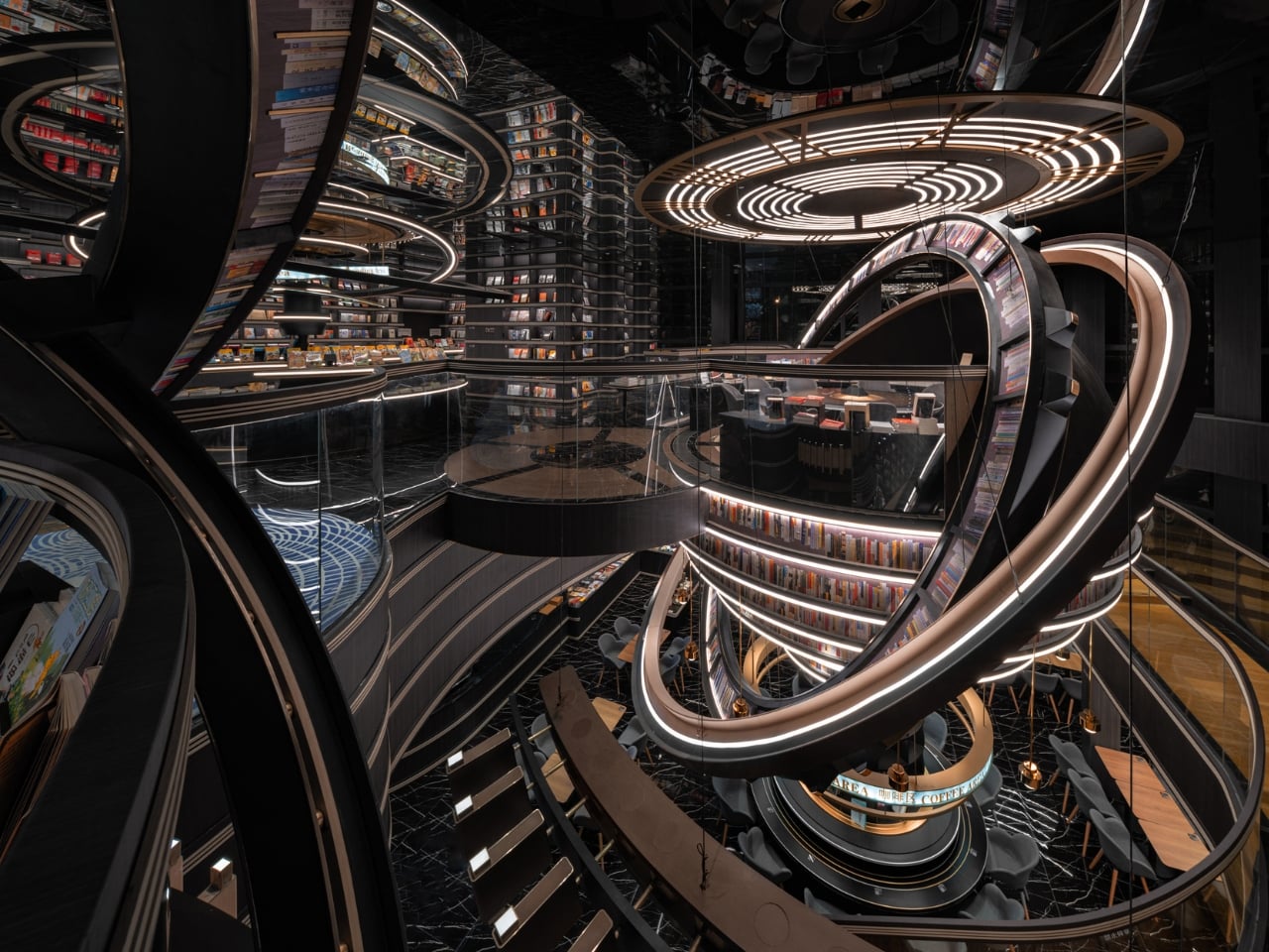What makes this space so mind-blowing? It’s all about those massive three-dimensional structures that look like astronomical instruments floating inside the store. Imagine concentric rings and geometric forms inspired by celestial mechanics, all reimagined as bookshelves and display areas. The books themselves seem to defy gravity, positioned on these dramatic structures in ways that make you feel like you’re browsing a library floating somewhere in deep space.