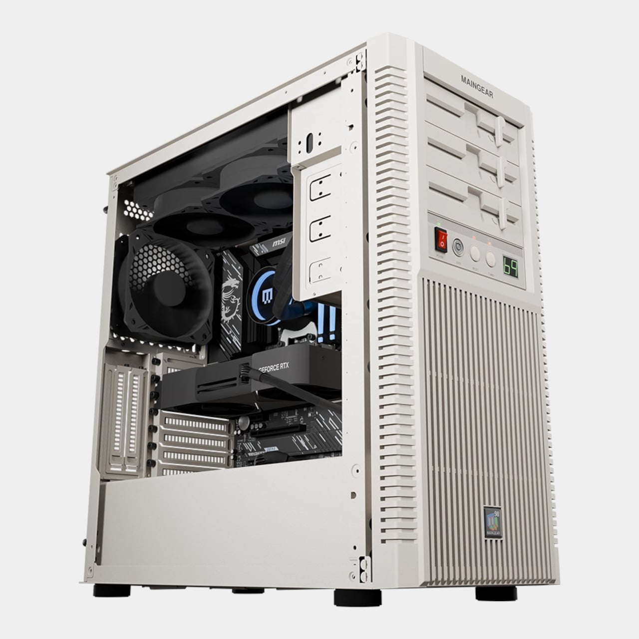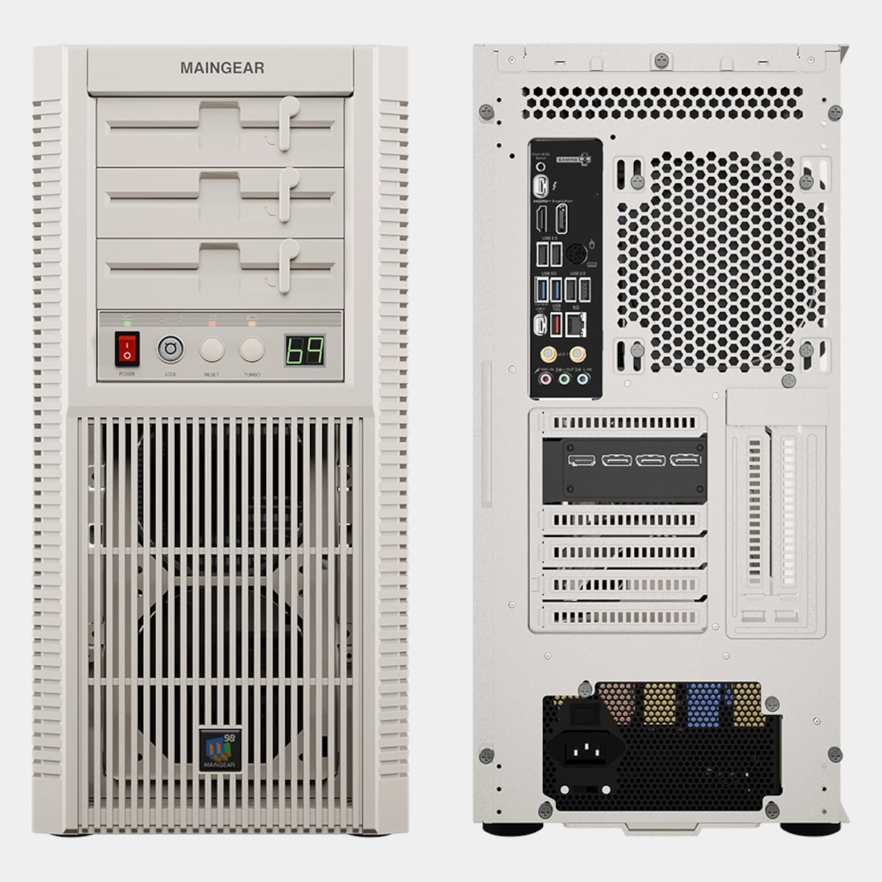 Retro98 feels more like a drop than a product line. Maingear limited it to 38 units: 32 standard builds and six water-cooled Retro98α rigs with braided ketchup-and-mustard cables. The brand positions it as something you will not find at a big-box store, and points out that you will not even find a Radio Shack next week. Each system is hand-built by a single technician, making it feel closer to a limited sneaker release than a typical prebuilt.