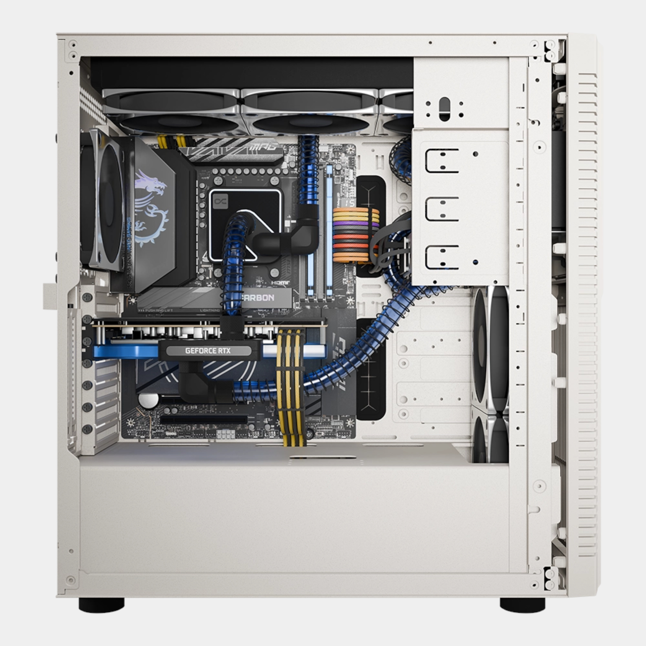 Even the lowest spec overshoots anything you could have imagined in 1998. The Retro98 5070 pairs an NVIDIA GeForce RTX 5070 with an Intel Core Ultra 7 265K, 32 GB of DDR5 at 6000 MT/s, and a 2 TB NVMe SSD. This is the kind of machine that runs Cyberpunk smoothly while looking like it should be loading StarCraft from a stack of jewel cases on the desk.