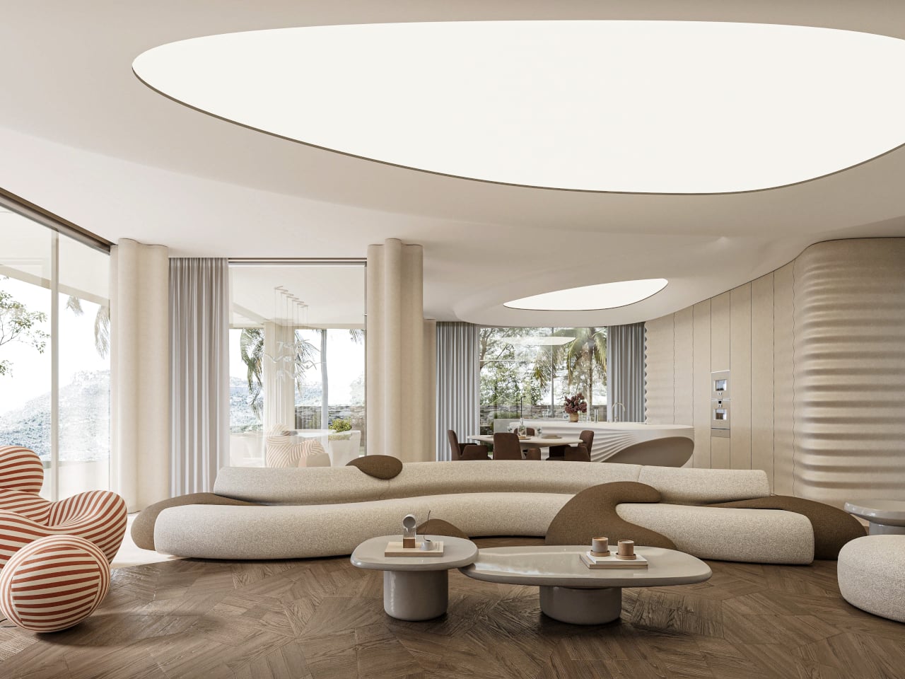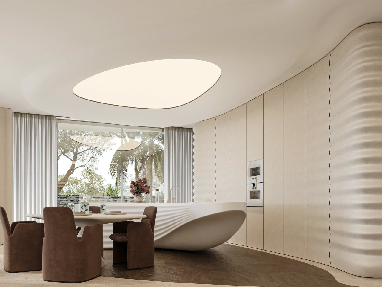Custom elements, from the sculpted kitchen island to soft, rounded seating and a large ovoid ceiling recess, all follow the same language. Walking from the living area to the dining space, you feel the ceiling dip and rise, the walls tighten and relax, as if the house is breathing slowly. Function stays straightforward, but the form insists on being felt with every step you take through the 400 m² interior.
