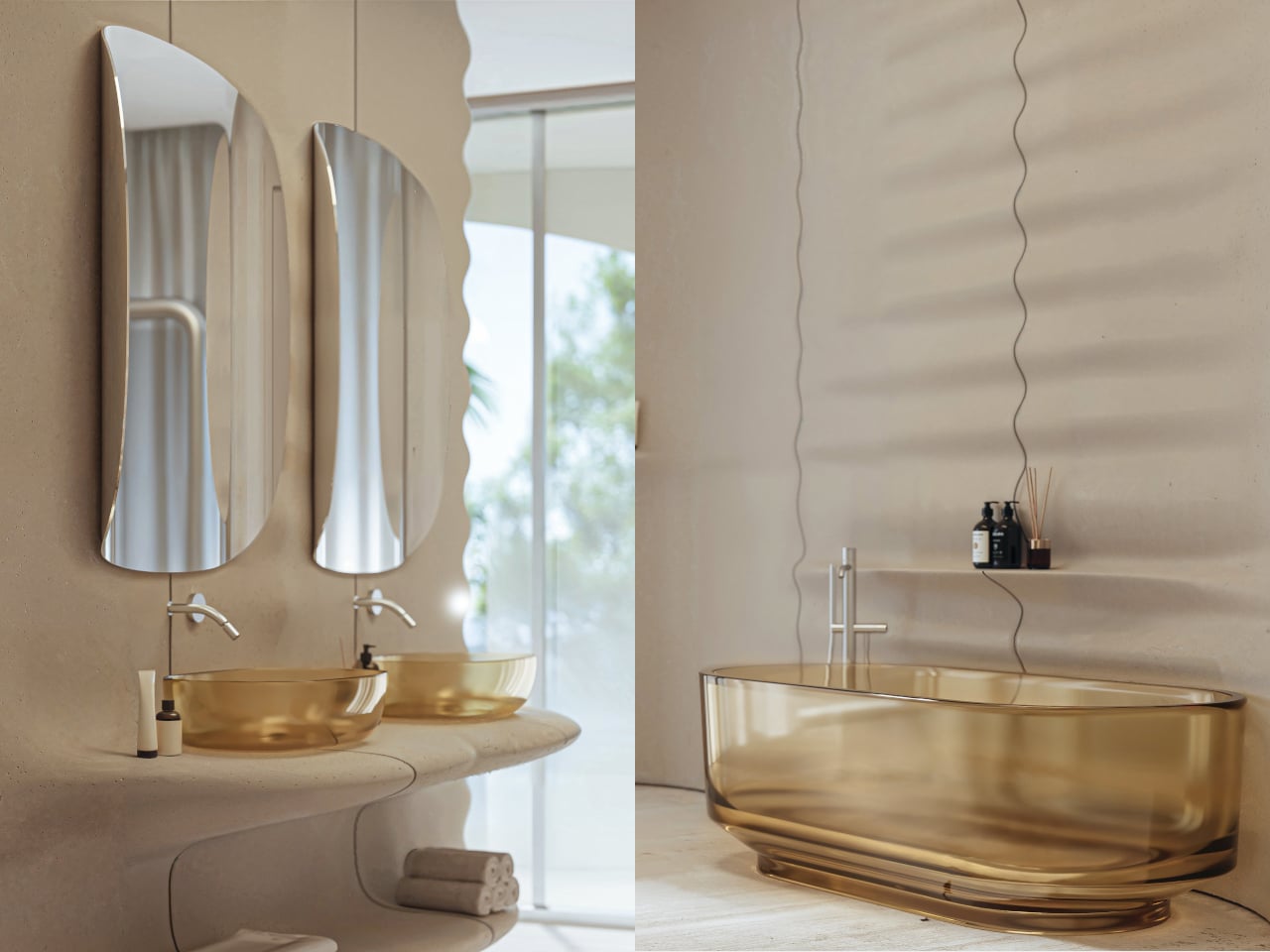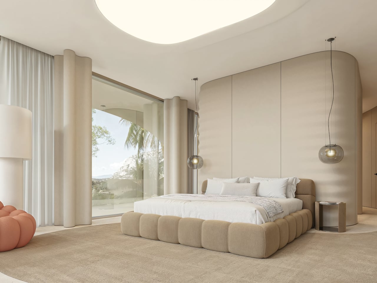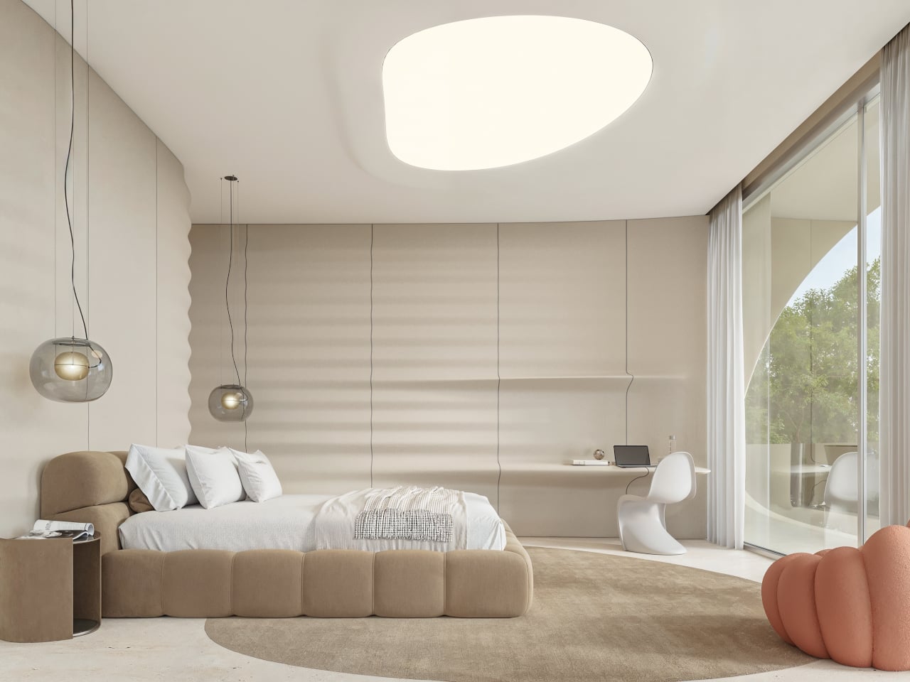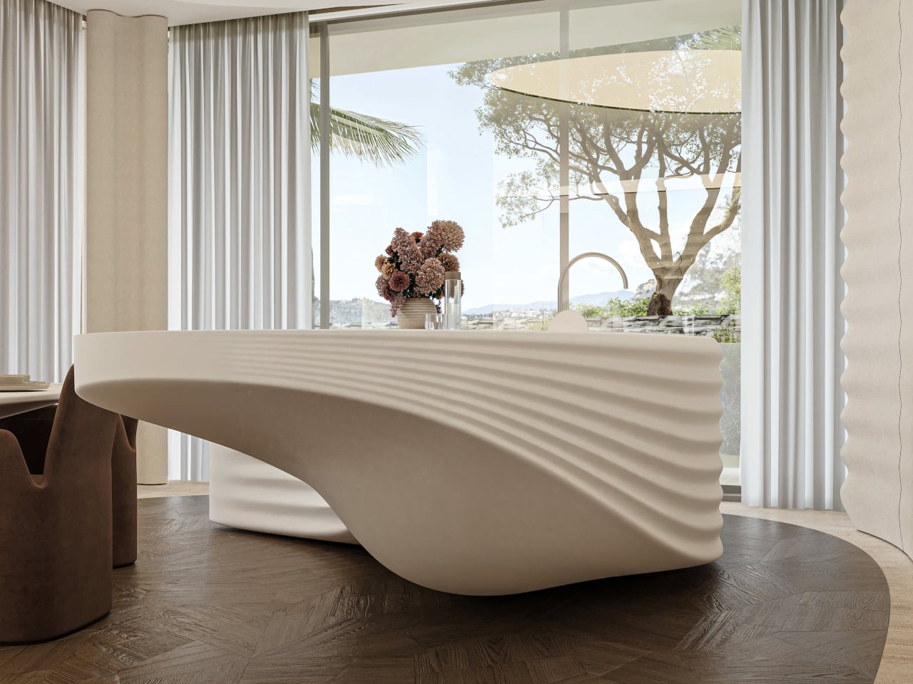 Inside, beige fiber concrete walls pick up the wave metaphor in a quieter way. Flowing parametric lines ripple across surfaces, echoing the exterior geometry without shouting about it. A restrained palette of white, sand, and pale wood keeps visual noise low, letting natural light slide along the curves. Rooms feel connected by a continuous rhythm, more like a tide moving through space than a series of separate boxes.