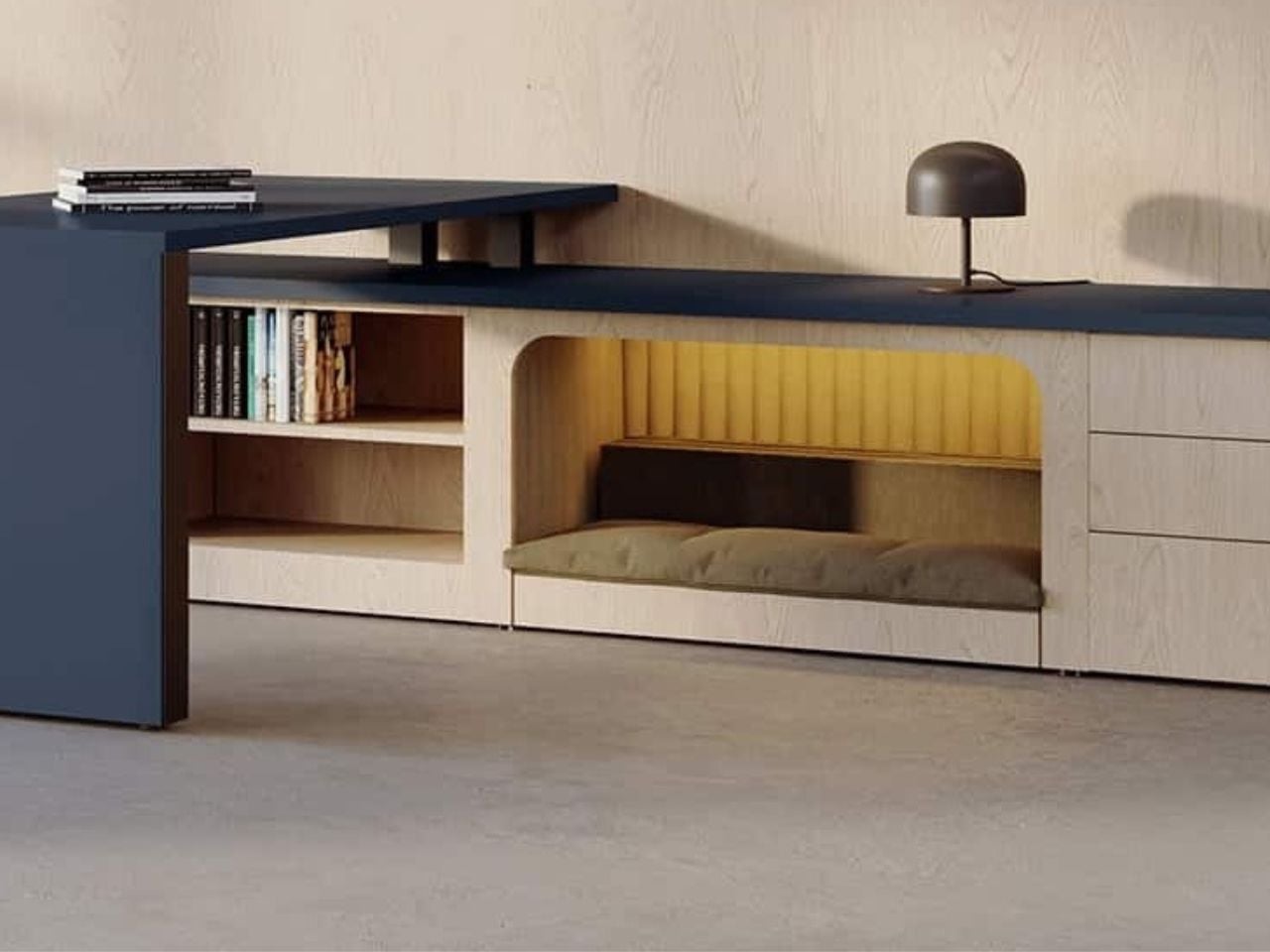 Integrated seamlessly into the desk is a built-in pet nook, a sheltered and intentional space designed for a dog to rest while their human works. Importantly, this is not an accessory or a playful add-on. There is no novelty bed clipped on at the last moment, no awkward cushion pushed beneath a workstation. The pet space is conceived as part of the desk from the very beginning and treated with the same seriousness as legroom, surface depth, or cable management.