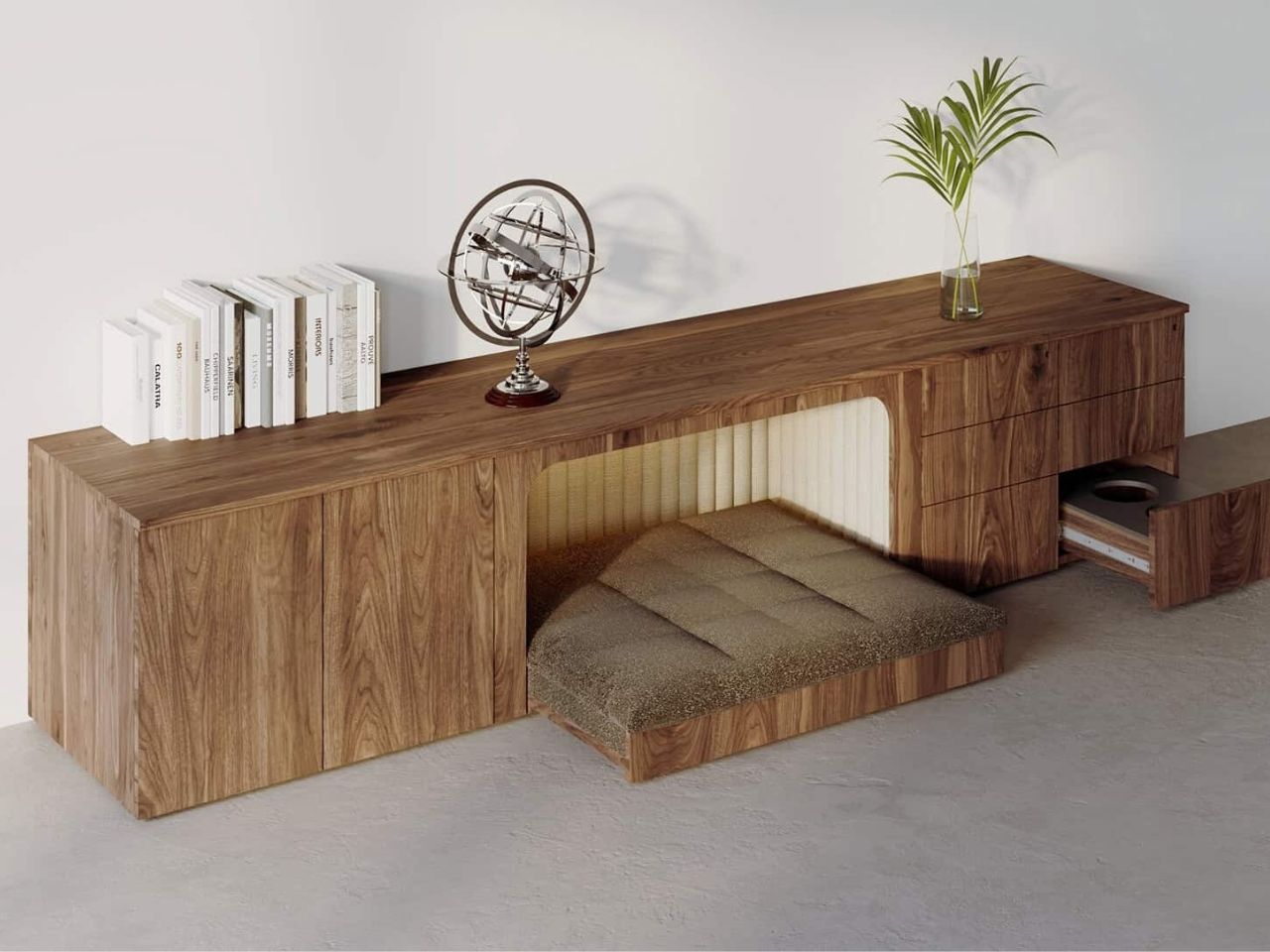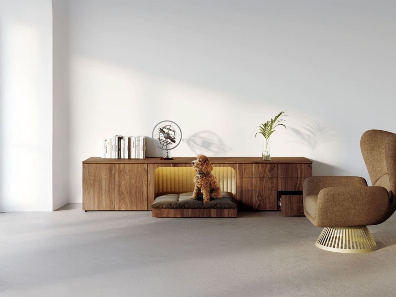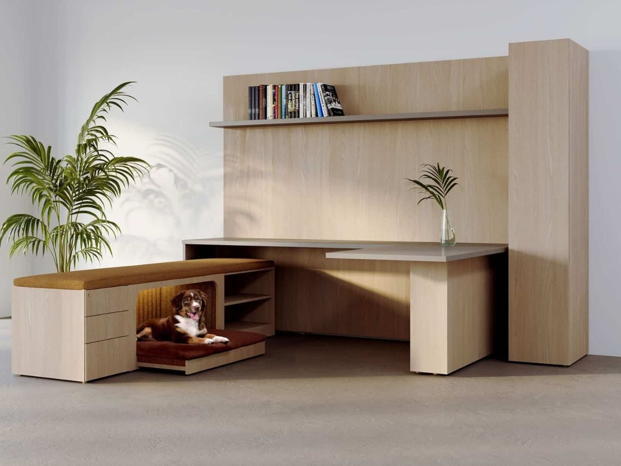 One of the most thoughtful aspects of the design is the flexibility of the pet nook itself. The bed is not fixed in place. It can slide forward to give a dog more room to stretch or shift during the day, then tuck neatly back into alignment with the desk edge when not needed. This small gesture keeps the workspace visually tidy and spatially efficient, preserving the desk’s clean silhouette while offering adaptability where it matters.