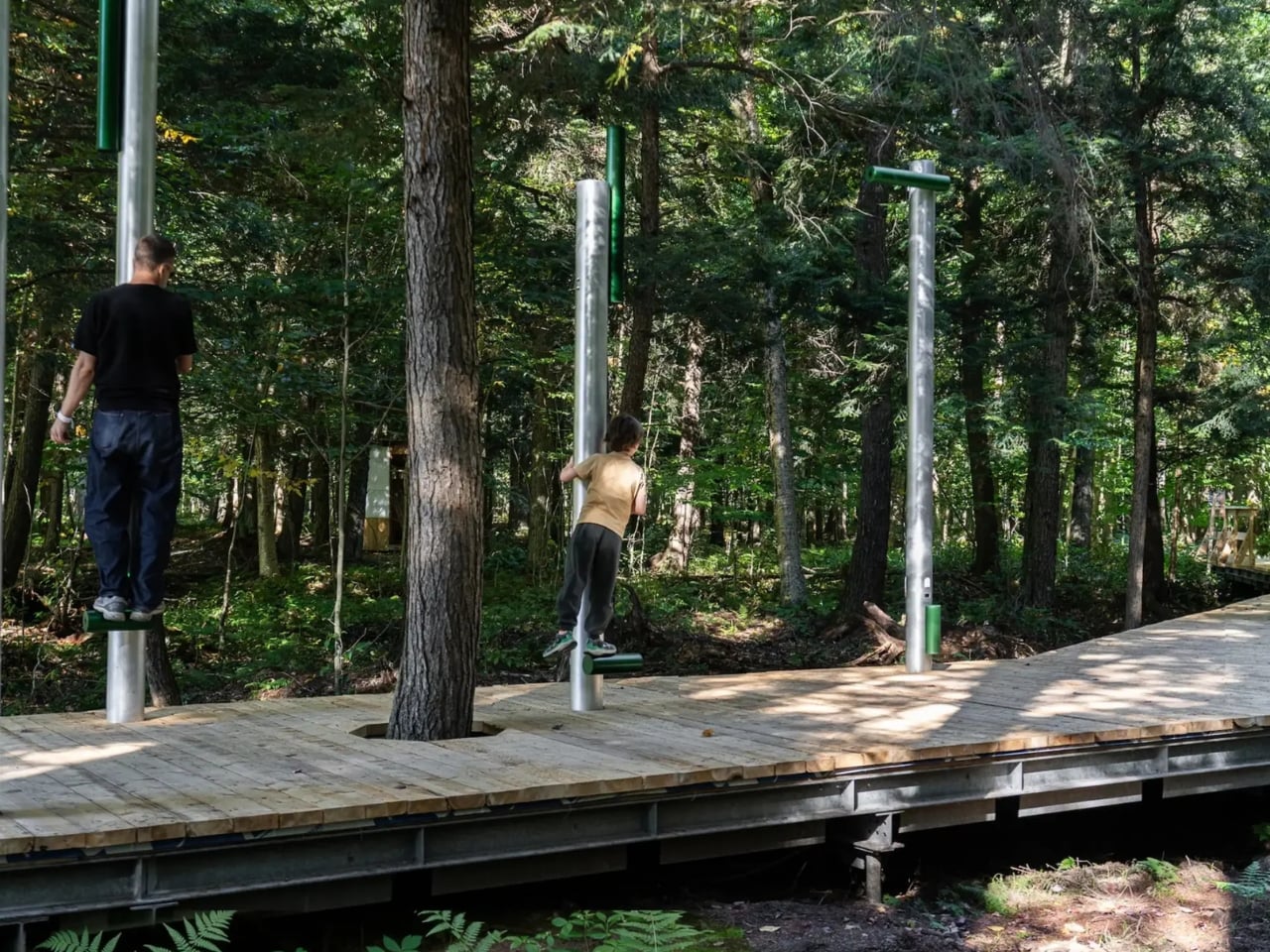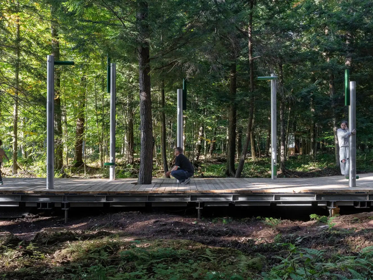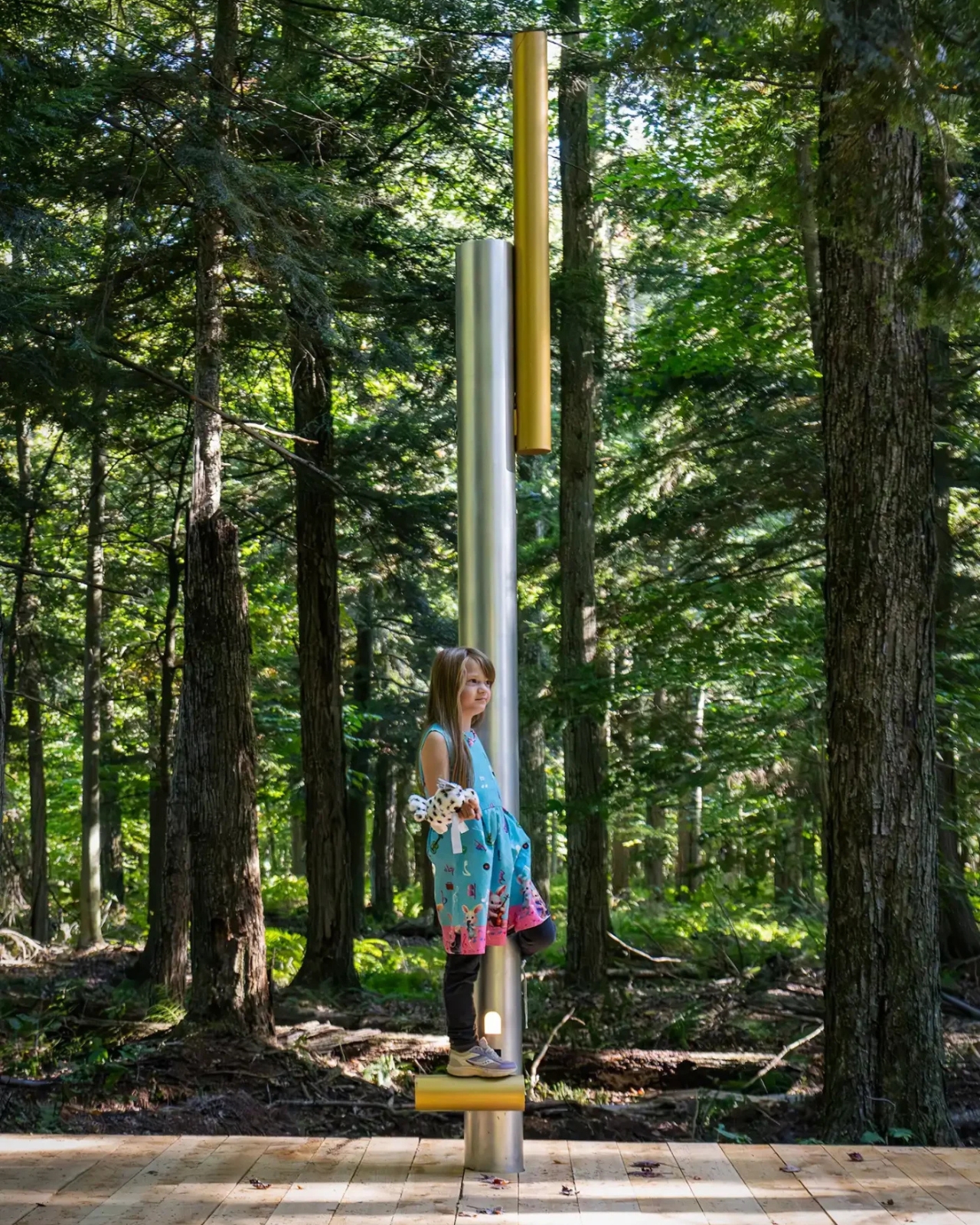 Located at Chouette à voir!, a bird of prey sanctuary in St-Jude, Quebec, this permanent installation transforms a 55-meter elevated boardwalk into an interactive musical journey through the seasons. Ten aluminum perching stations punctuate the path, each one waiting for a human visitor to activate its hidden soundscape. The design is brilliantly simple: step onto a green perch, and you become part of the forest’s symphony.