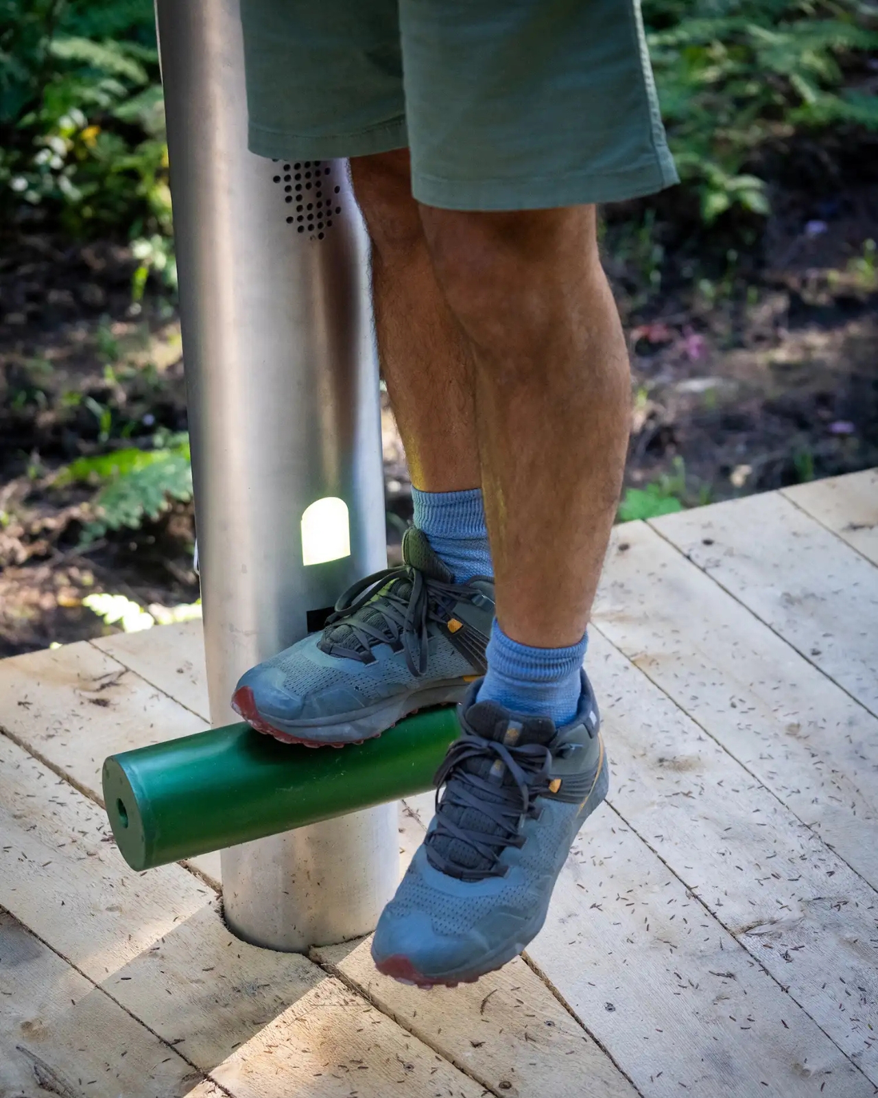 The physical design is minimal but thoughtful. The aluminum perches create a striking contrast against the organic textures of the red cedar and spruce boardwalk, highlighting the intentionality of human presence in wild spaces. Each station includes sensors that detect when someone steps up, triggering both a soft light and the corresponding bird call. The act of perching itself becomes meaningful. You’re balancing, aware of your body, suspended between the marsh below and the forest canopy above. It demands a different kind of attention than simply walking through.