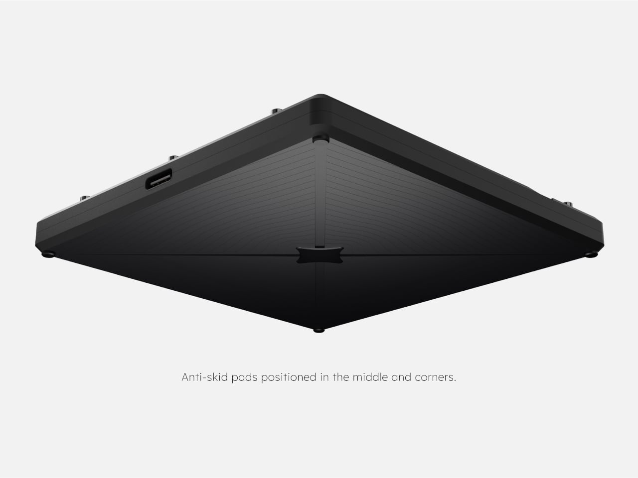 Anti-skid pads on the underside keep the base steady even when fully loaded, and the low, square footprint behaves more like a small dock than a loose drive. On a crowded desk with a laptop, tablet, and monitor, Uroq stays put instead of sliding around with every cable tug. One cable runs to the computer, while the rest of the complexity stays hidden inside the stack.