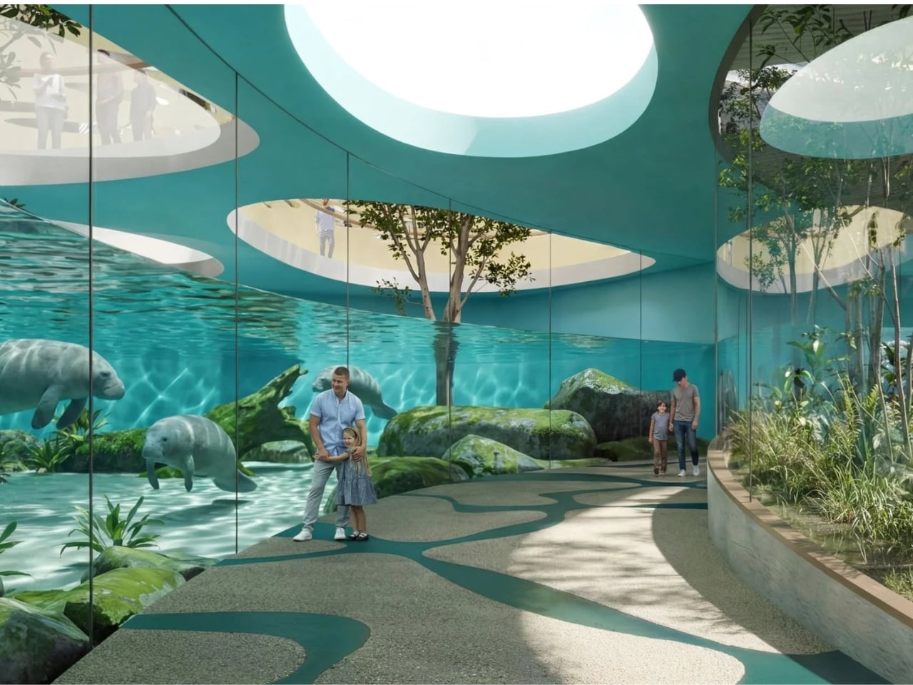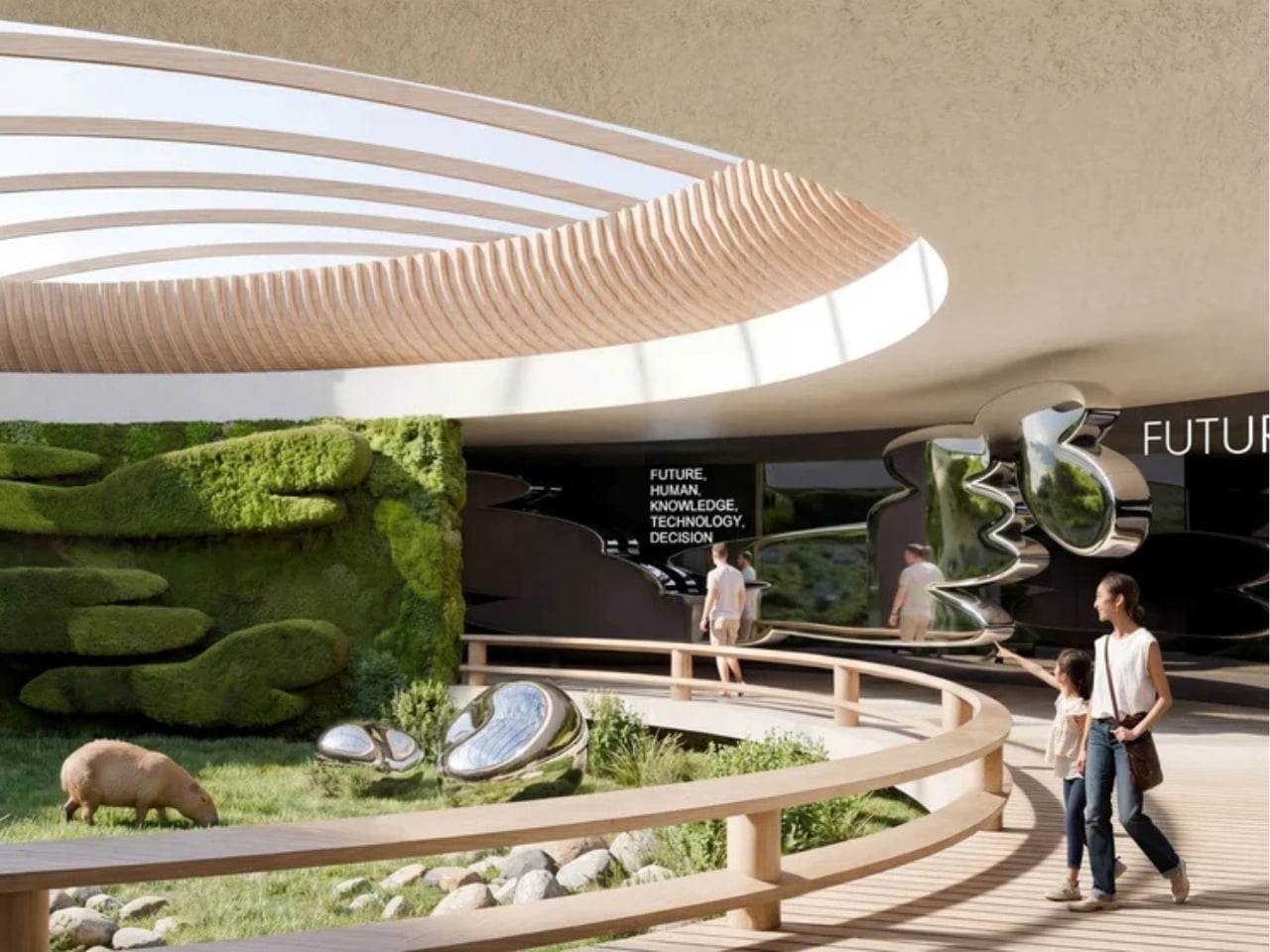 The animal habitats themselves are impressively diverse. Giant tortoises live among volcanic terrain with elevated walkways tracing along their space. Capybaras hang out near living moss walls and chrome sculptures. There’s even a sea lion courtyard and a central garden connected by a spiral path. Each zone captures the essence of its element without resorting to theme park theatrics.