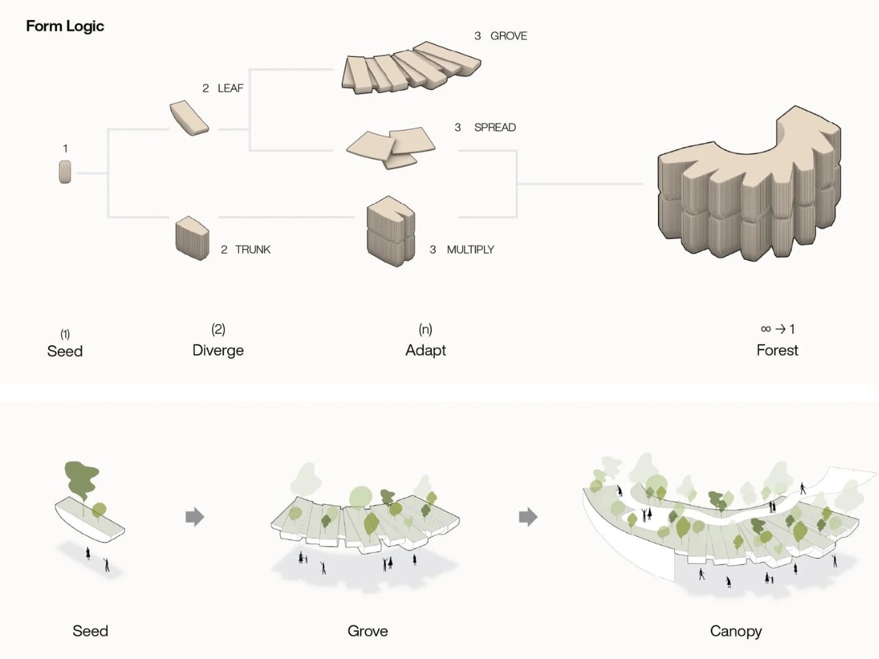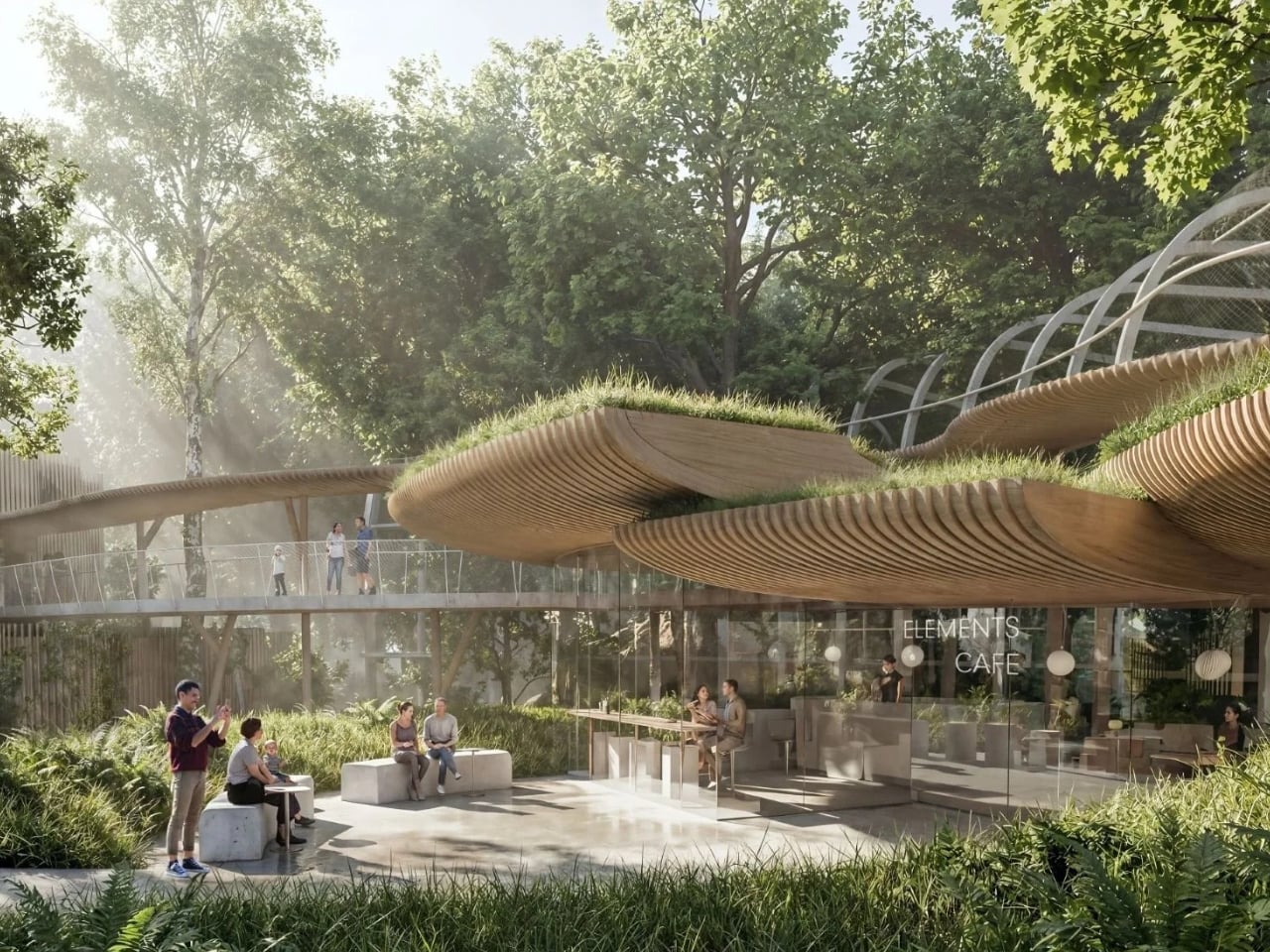 What makes this design fascinating is how VMA used a single architectural seed profile that diverges and adapts throughout the building. Think of it like watching one musical theme morph and transform across a symphony. The result? A unified facade that looks like a forest of timber-clad profiles rising like tall planters, each capped with green roofs. This modular approach means the building can respond individually to different needs (enclosure, shading, circulation, landscape integration) while still feeling like one cohesive whole.