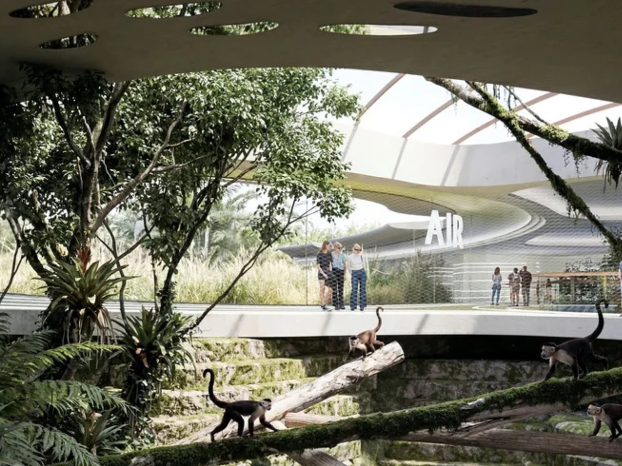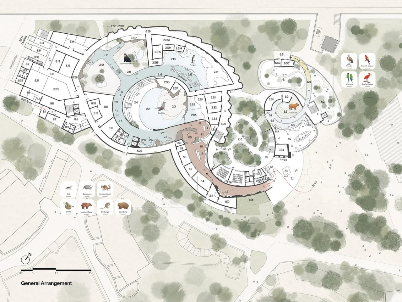 VMA didn’t just think about the building in isolation either. The project establishes a new public open space that connects the zoo’s main entrance, the existing Orientarium complex (a Southeast Asian wildlife facility completed in 2022), and this new pavilion. The design includes a series of planted roof decks and ramps serving a cafe and aviary, creating multiple layers of experience both inside and outside the main structure.