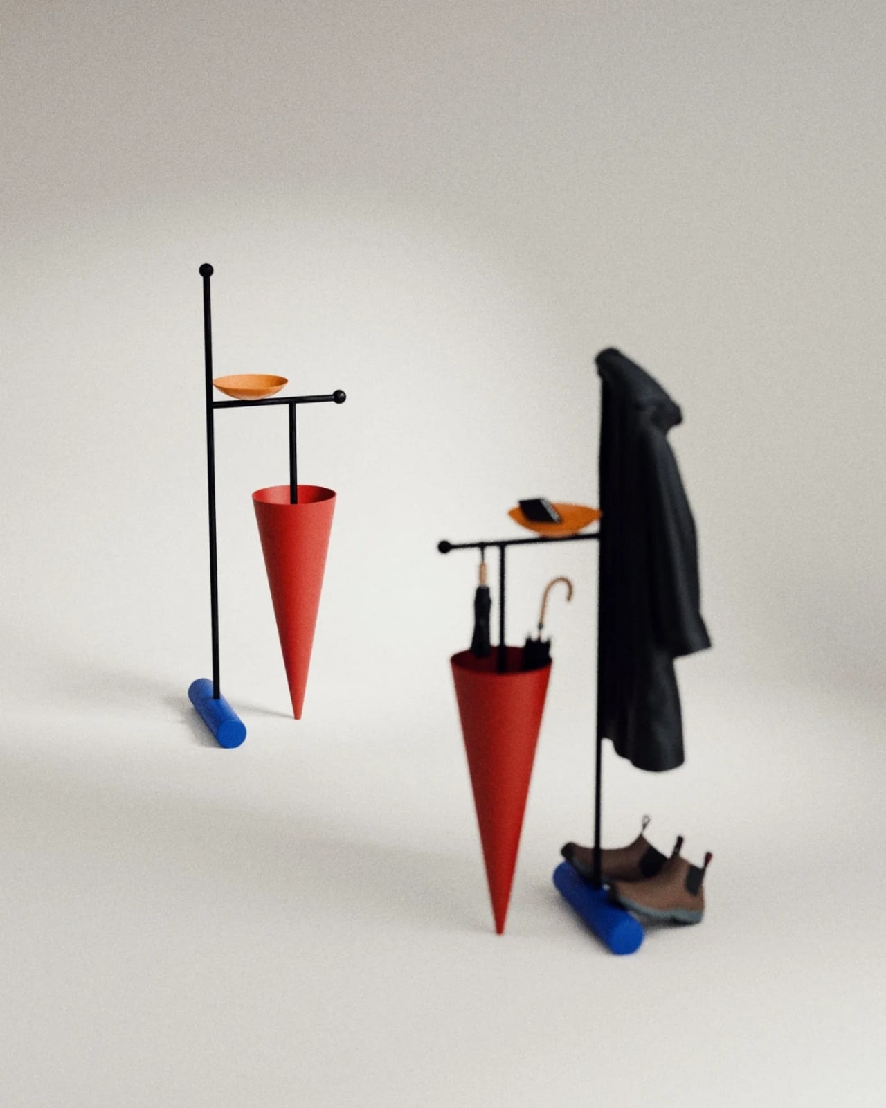 Let’s talk about what it actually does, because this isn’t just pretty geometry. The cone holder catches your dripping umbrella without taking up much floor space. The extending arm supports a coat hook that can handle your wet jacket. That orange dish? Perfect for corralling keys, sunglasses, your phone, or whatever else you’re juggling when you stumble through the door. And at the base, there’s room to kick off your shoes, keeping everything you need for coming and going in one tidy vertical arrangement.