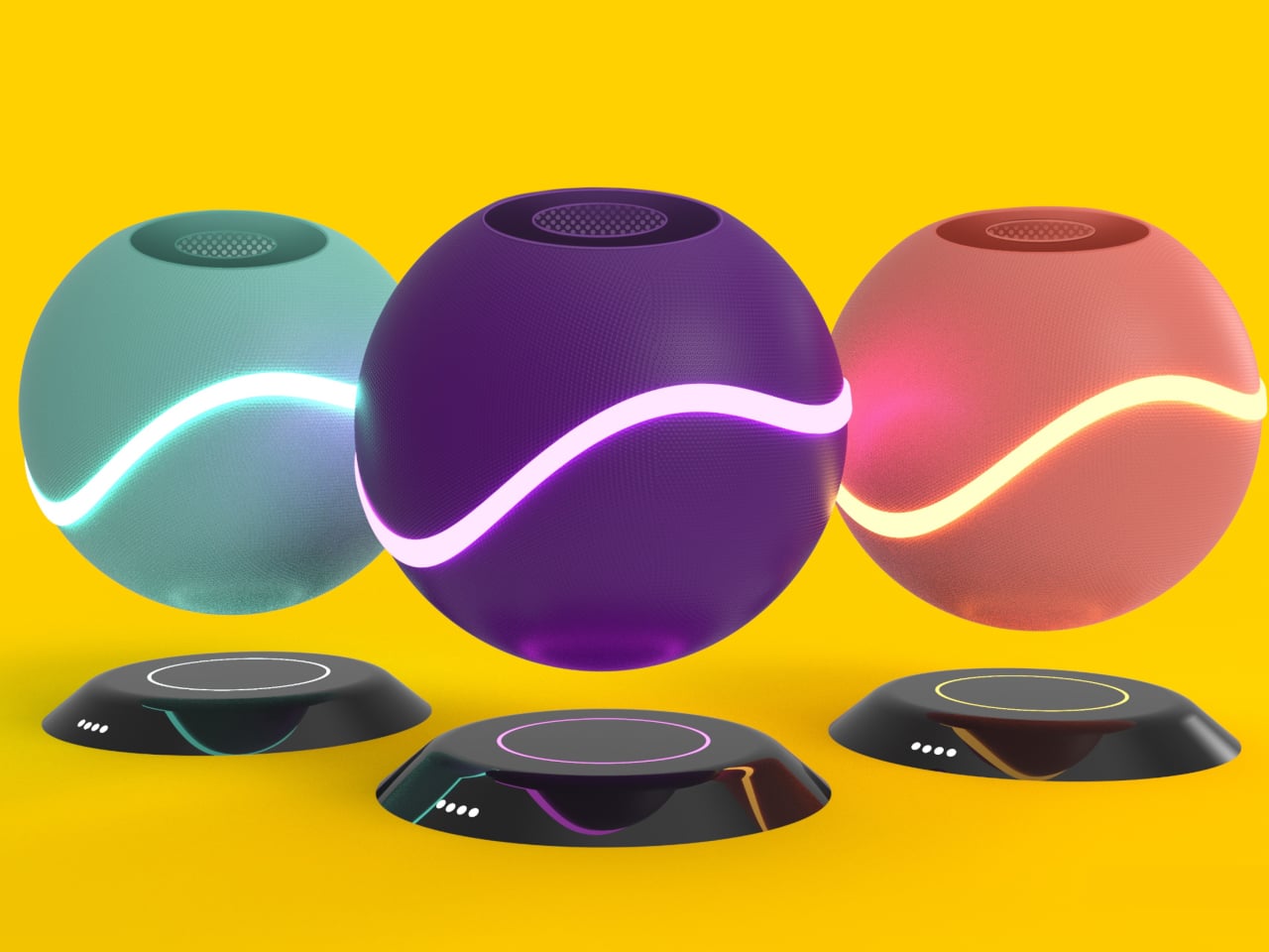 Magnets and coils in the base and sphere handle the hovering act, powered by a 12-15 V USB-C adapter, while ambient LEDs in the base ring and the band around the sphere handle the glow. The floating form and soft light sell the idea that scent is something weightless moving through the room, not just vapor coming out of a nozzle buried in plastic.