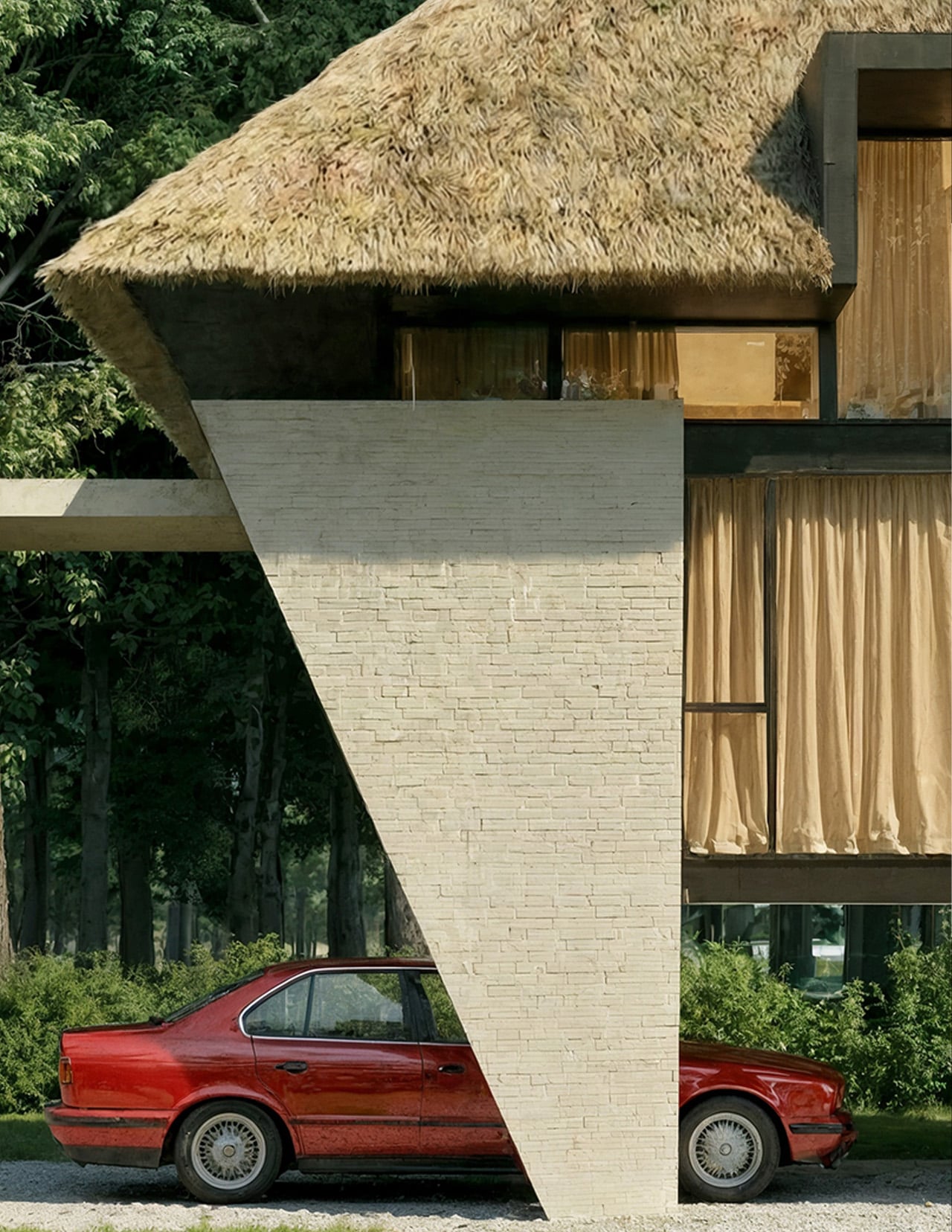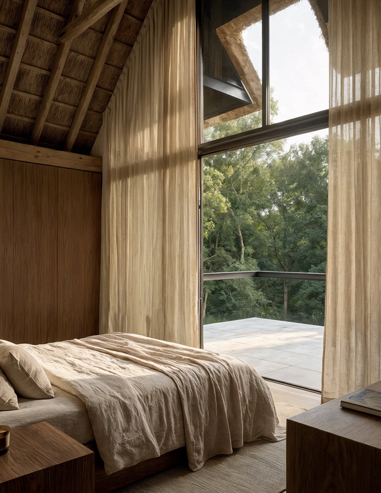 The pitched thatched roof brings vernacular building wisdom into the composition. Reed covering references construction methods that local builders have refined over generations, chosen not for aesthetic reasons alone but for genuine climate performance. The material insulates naturally while its textured surface contrasts sharply with the geometric precision below. This roof gives the villa its recognizable silhouette, visible from across the garden as a form that connects historical building practices with contemporary spatial thinking.