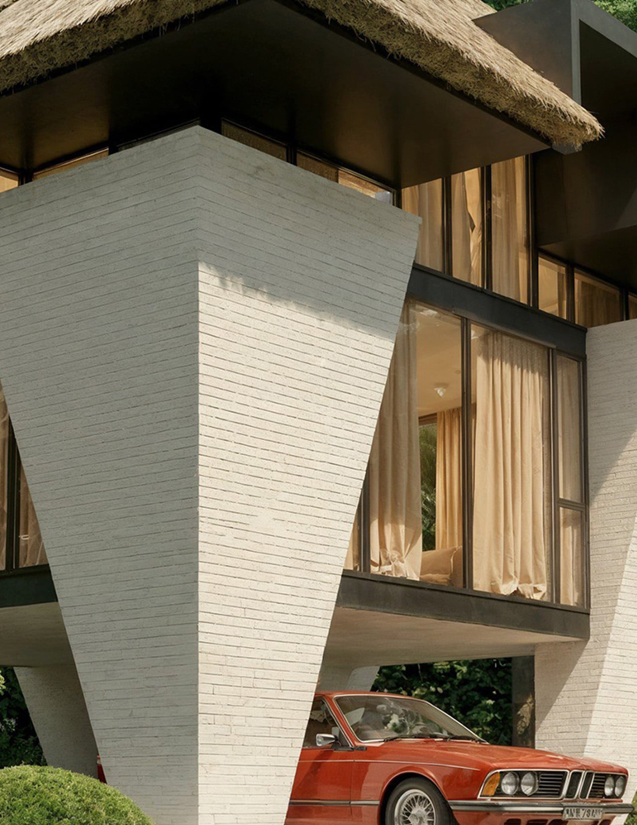 Those four columns do more than hold up the building. Their geometric form creates shifting shadow patterns throughout the day, turning the ground beneath into an animated space that changes with the sun’s movement. The white brick construction gives the supports a sculptural quality that makes them feel like intentional design elements rather than structural afterthoughts. By reducing the building’s footprint to these precise points of contact, the villa sits lightly on its site while maintaining a strong architectural presence.