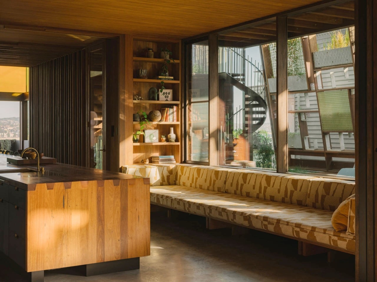 This is Australia’s first certified carbon-positive home under the Active House Alliance, which means it produces more energy than it consumes over a year. Solar panels handle the energy generation. Rainwater and greywater systems irrigate the productive garden, which includes fruit trees, vegetables, herbs, and even chickens. The spotted gum cladding on the exterior got the Shou Sugi Ban treatment, that Japanese charring technique that makes timber more resilient and gives it a charcoal finish. Low embodied energy material that will age well in the coastal climate near Shelly Beach.