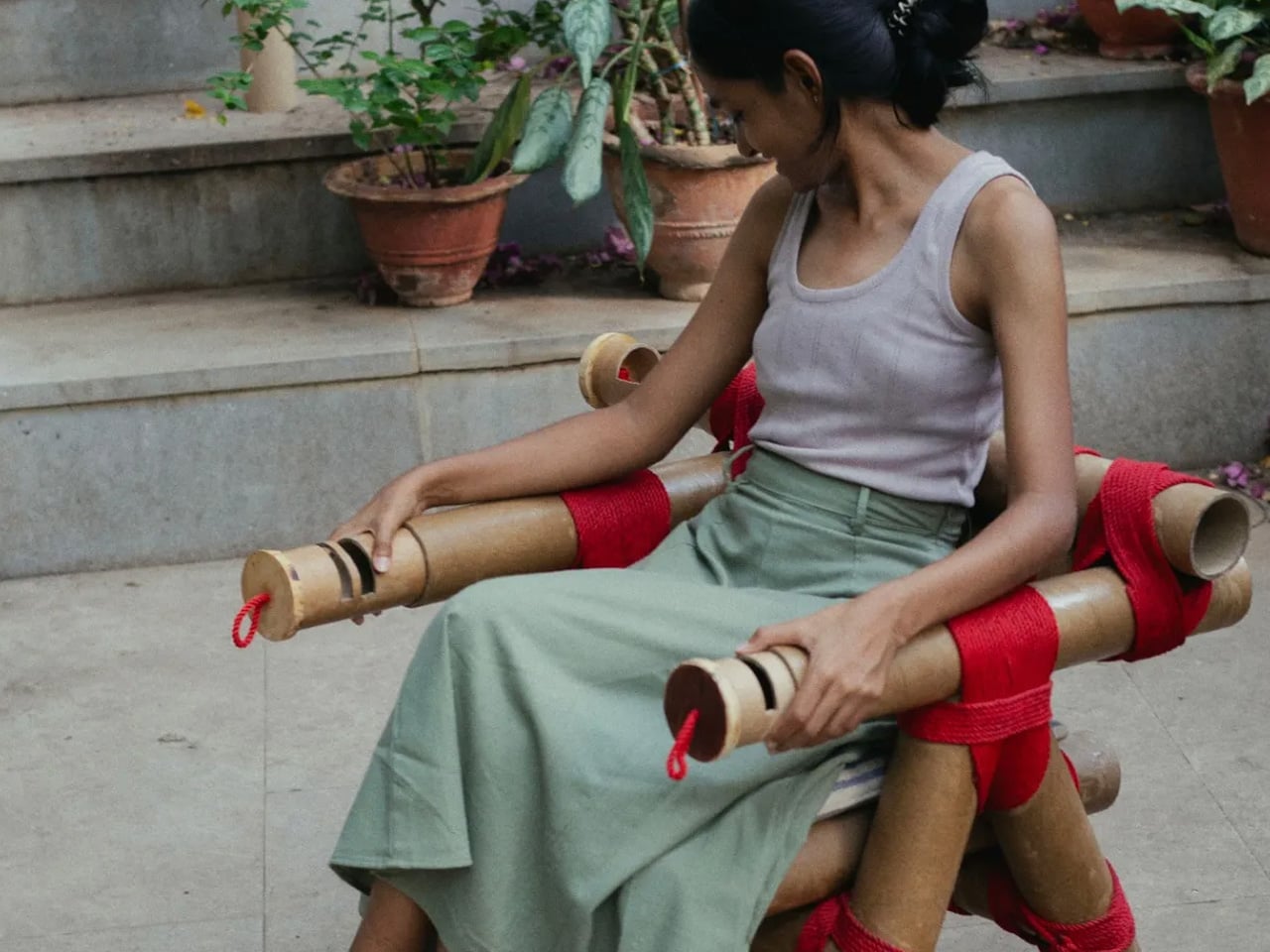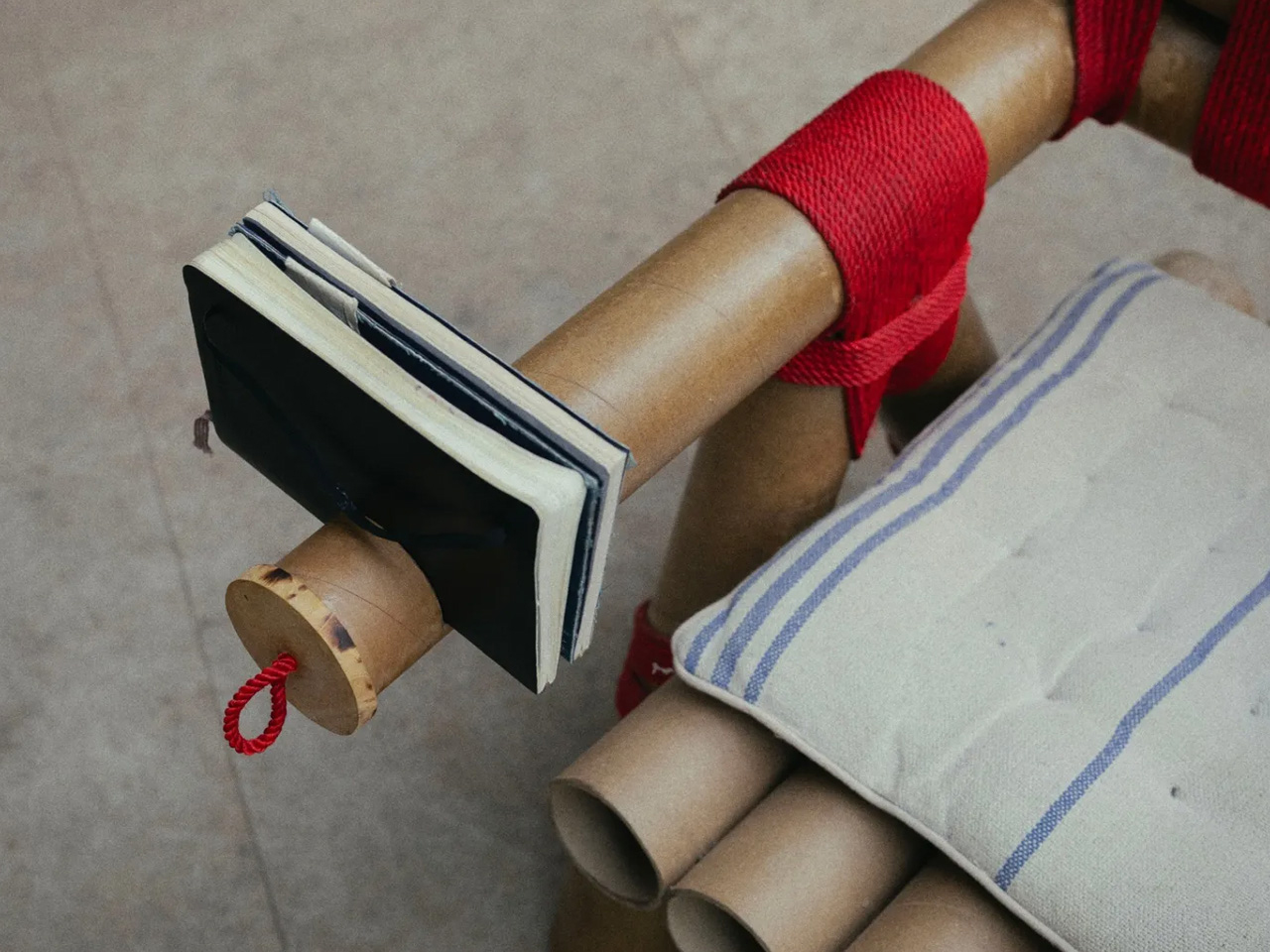 The Paper Tube Chair reframes design as a democratic act rather than a luxury pursuit. Conceived by the Dhammada Collective in Bhopal, founded by Nipun Prabhakar, it echoes Pierre Jeanneret’s library chairs yet replaces teak with discarded cardboard tubes. The studio advocates “joyful frugality”, applying strong design principles using overlooked materials so good furniture need not remain a metropolitan privilege. Cardboard cores from a print shop, destined for landfill due to glue layers that prevent recycling, are intercepted and cut like bamboo. Surplus vermilion rope from weaving workshops binds the tubes in a continuous figure-eight lashing that tightens under load and allows later repair.