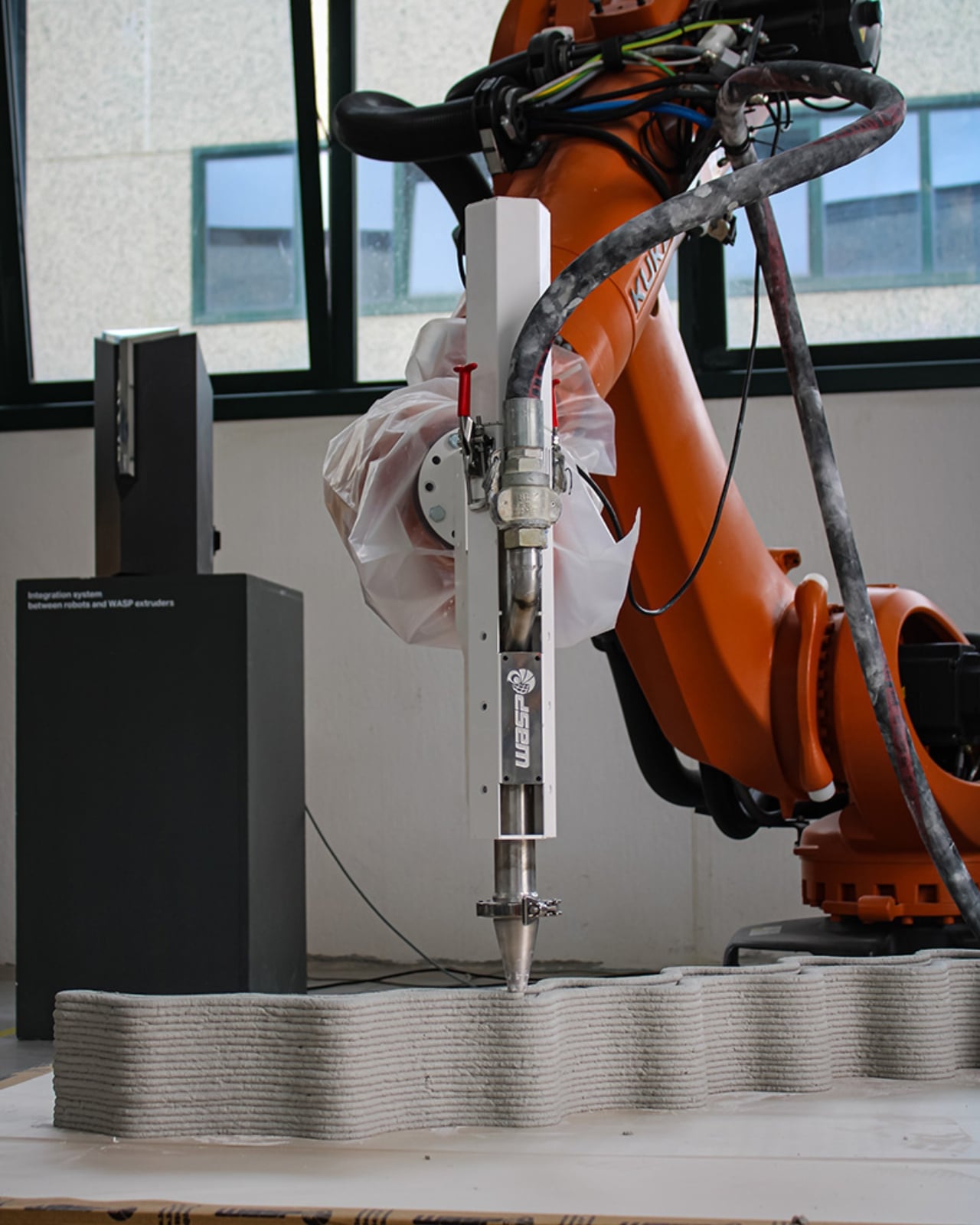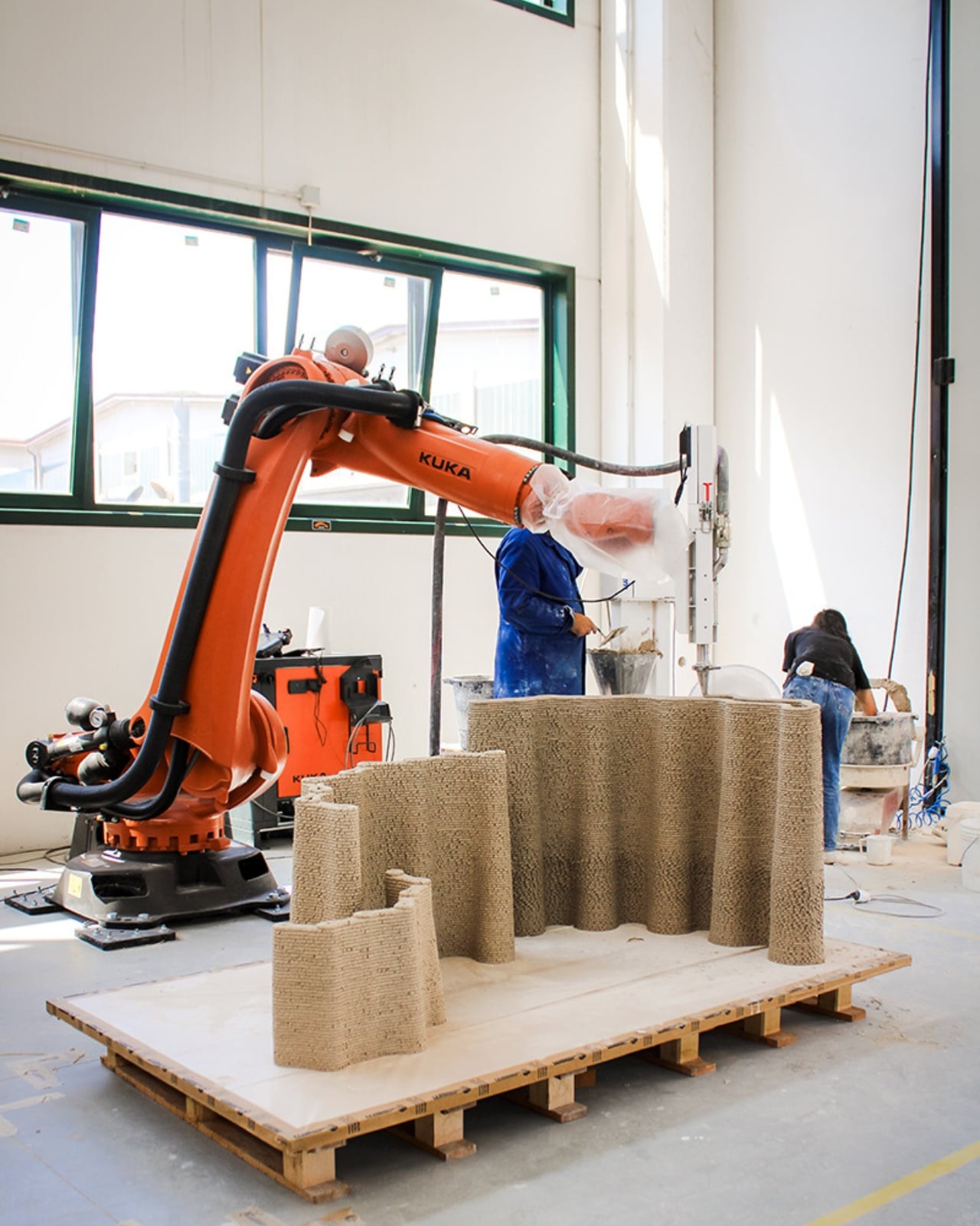 To produce the material, nixtamal waste is collected, dried, shredded, and pulverized down to a consistent particle size that works for extrusion. It’s then blended with mineral aggregates and organic binders to create a printable mixture. Printability tests were conducted using a WASP Concrete HD Continuous Feeding System integrated with a KUKA robotic arm, meaning the building process is precise, automated, and repeatable. The result doesn’t just look like a structural material. It performs like one.