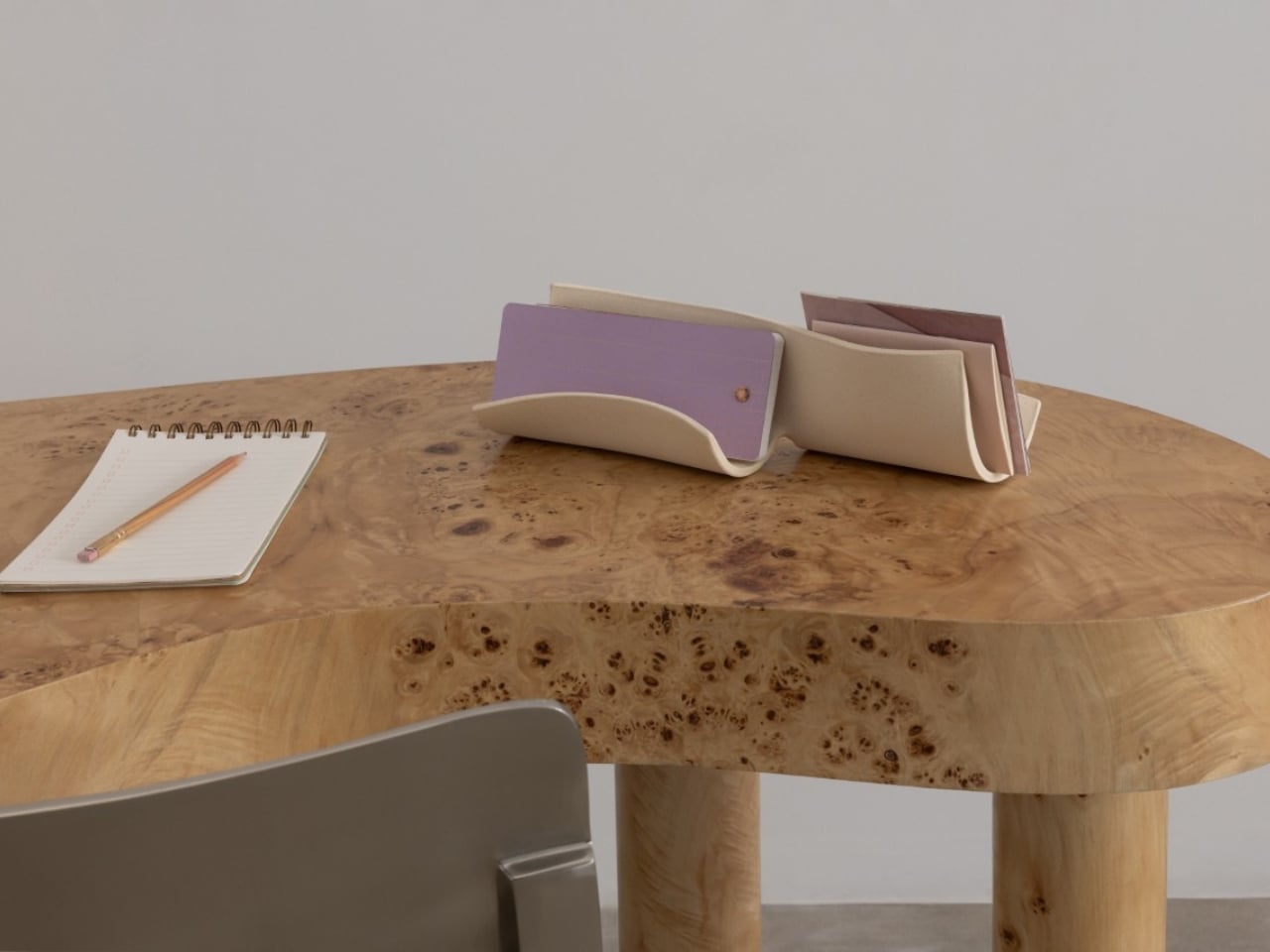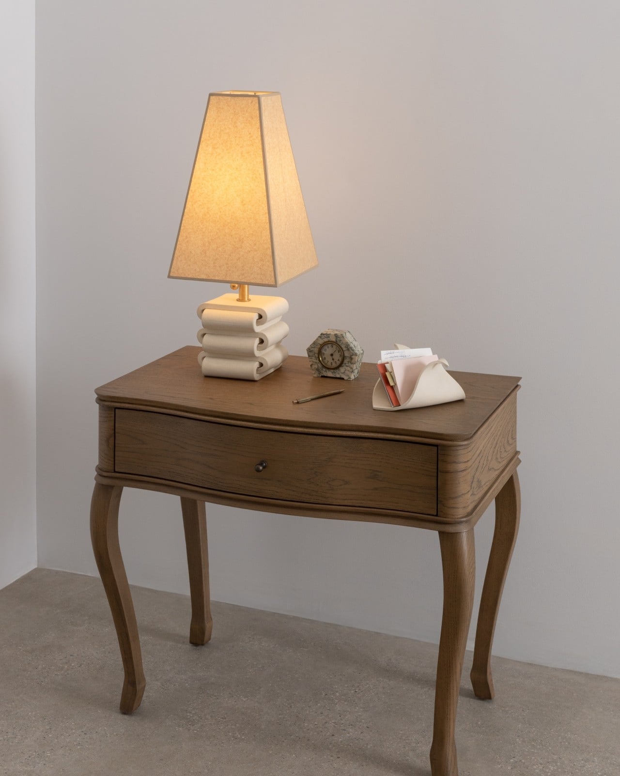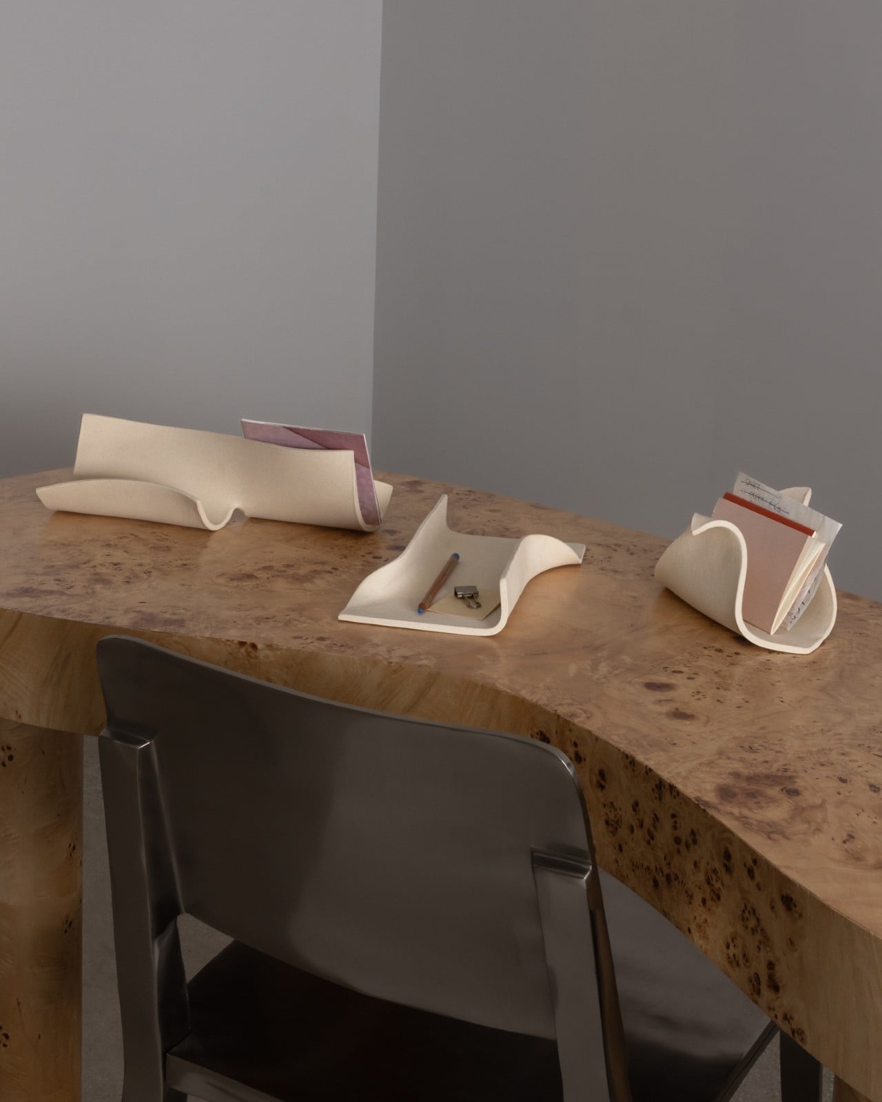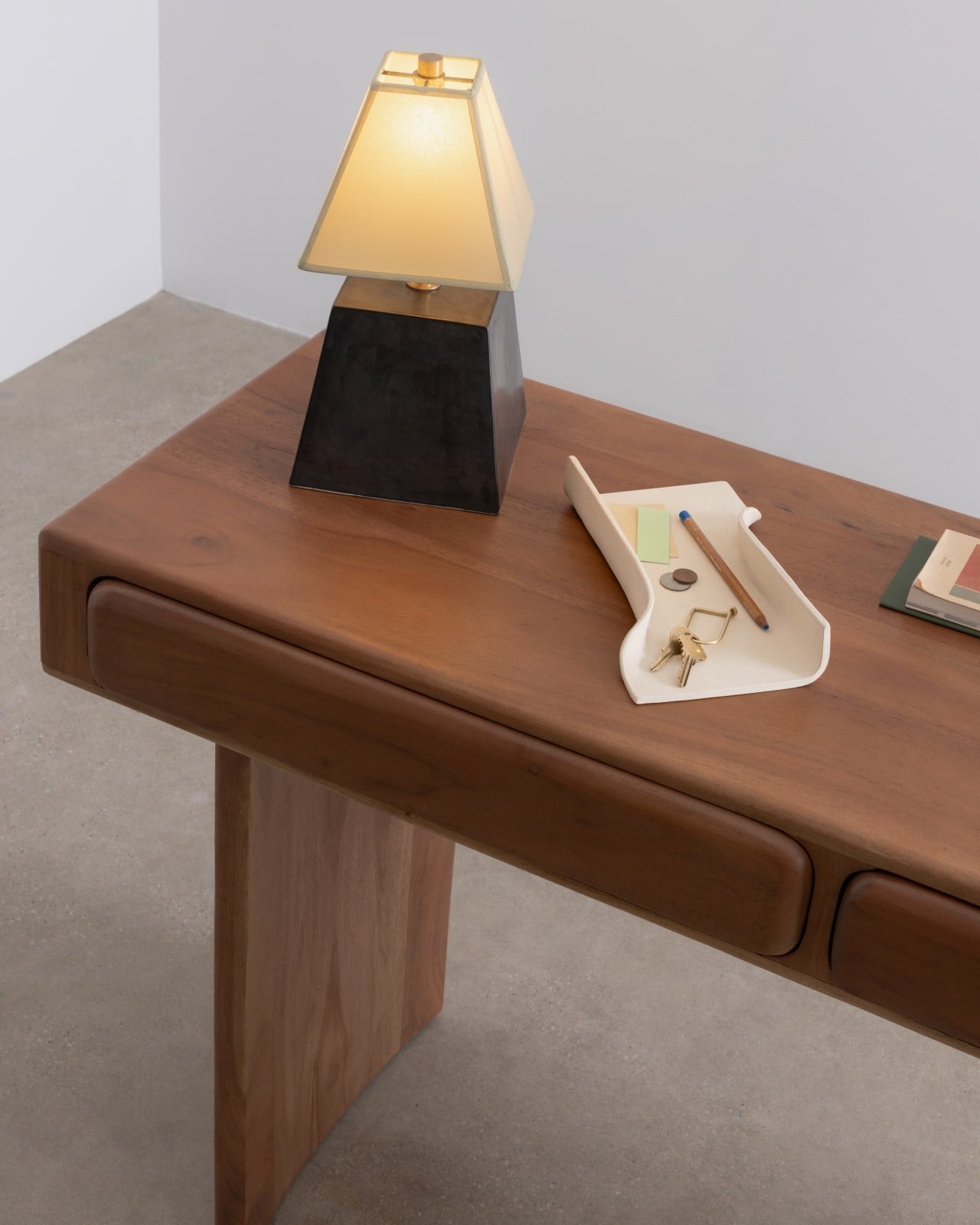 Then there’s the CACHE Organizer ($120), and it might be the most quietly clever of all. Its triangular form transforms what is essentially an everyday fold into something that feels like a gesture. The depth makes it practical for taller items like markers, scissors, or rolled-up sketches, but the shape gives it enough visual presence to hold its own as a sculptural object. At 8.5 inches long and 4 inches tall, it fits comfortably on a nightstand or shelf without demanding attention.