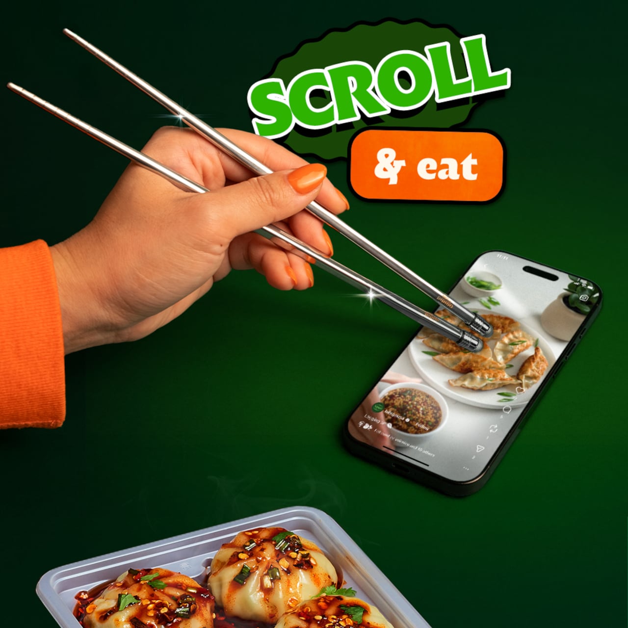 bibigo, the Korean food brand behind what the internet has collectively decided are its favorite dumplings, decided to design for the habit instead of lecturing about it. ScrollSticks are dual-ended chopsticks with touchscreen tips, one end for picking up food and the other for tapping, swiping, and scrolling on a phone. The premise is simple: two dedicated ends for two different jobs, keeping the oil and sauce where they belong.