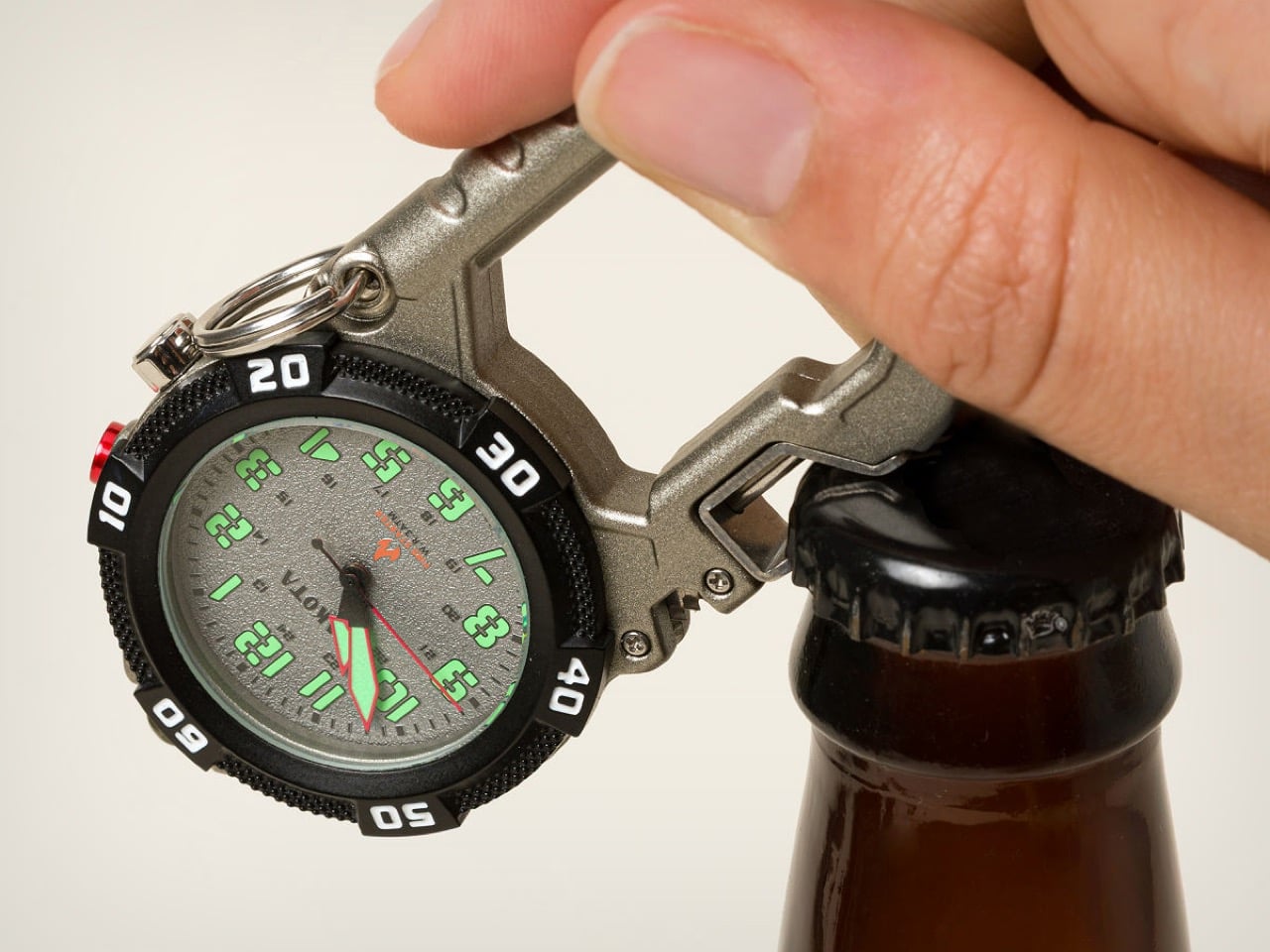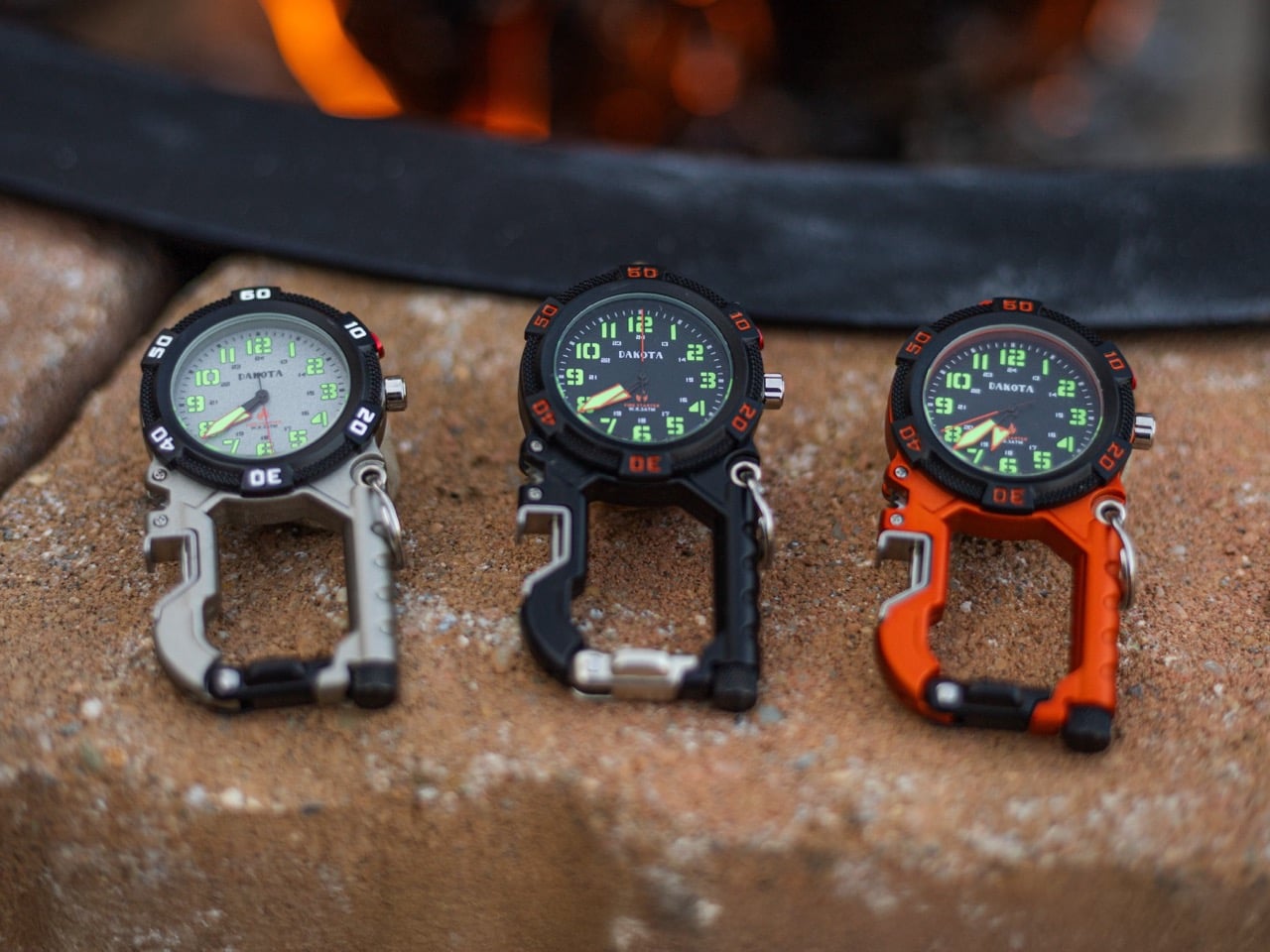 Before we talk about the watch itself, Dakota Watch Company used this particular elevated-carabiner format to pack even more tools, making the pocket watch something that goes beyond just keeping you punctual. A built-in bottle opener lets you crack open a brew when you’re in the great outdoors, and it could be used to pry open lids too (not to be mistaken with a can opener). A slight serrated corner above the bottle opener doesn’t outline a specific purpose, but it looks sharp enough to cut through rope with a little vigorous action. You could use it to scrape against the flint-rod too, lighting that campfire to go perfectly with the chilled beer you just cracked to get the evening started.