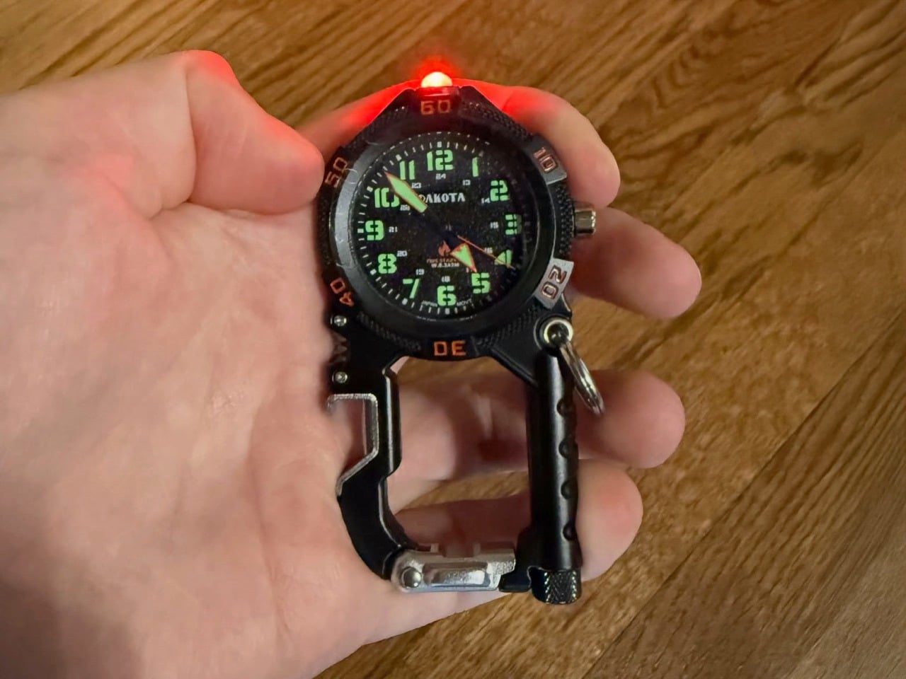 Build almost exclusively for the outdoors, the Flint Clip Carabiner Watch also packs a discreet red LED microlight, used for illuminating the way in stealth scenarios where bright lights could give away your position. The red light (activated using a button at the 2 o’clock position) provides the right amount of visibility without necessarily blowing your cover or obscuring your low-light vision in the dark. This means you can see with the light, but continue to do so even after the light’s shut (unlike most flashlights that leave you blinded in the pitch dark once the light’s turned off).