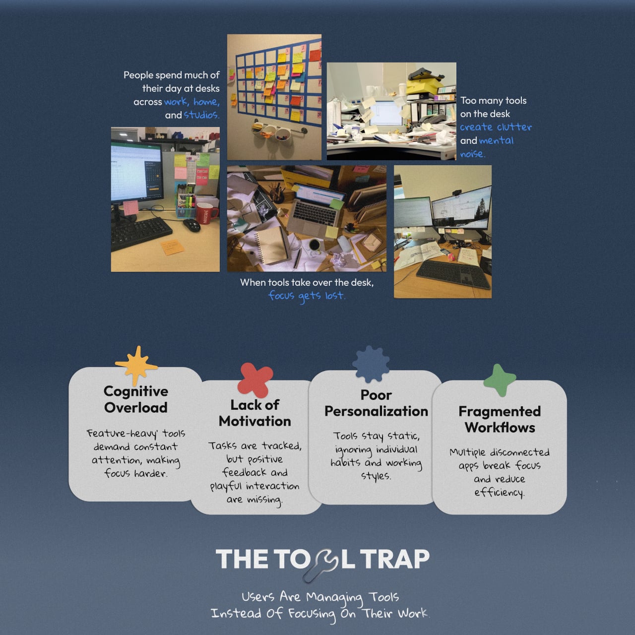 The concept calls the current situation the “Tool Trap,” the idea that users end up managing tools instead of focusing on their actual work. Plable identifies the specific gaps, cognitive overload from feature-heavy tools, missing positive feedback, fragmented workflows across disconnected apps, and static systems that don’t adapt to individual habits. The response is a single, compact desk presence that anchors everything without trying to replace every tool you already use.