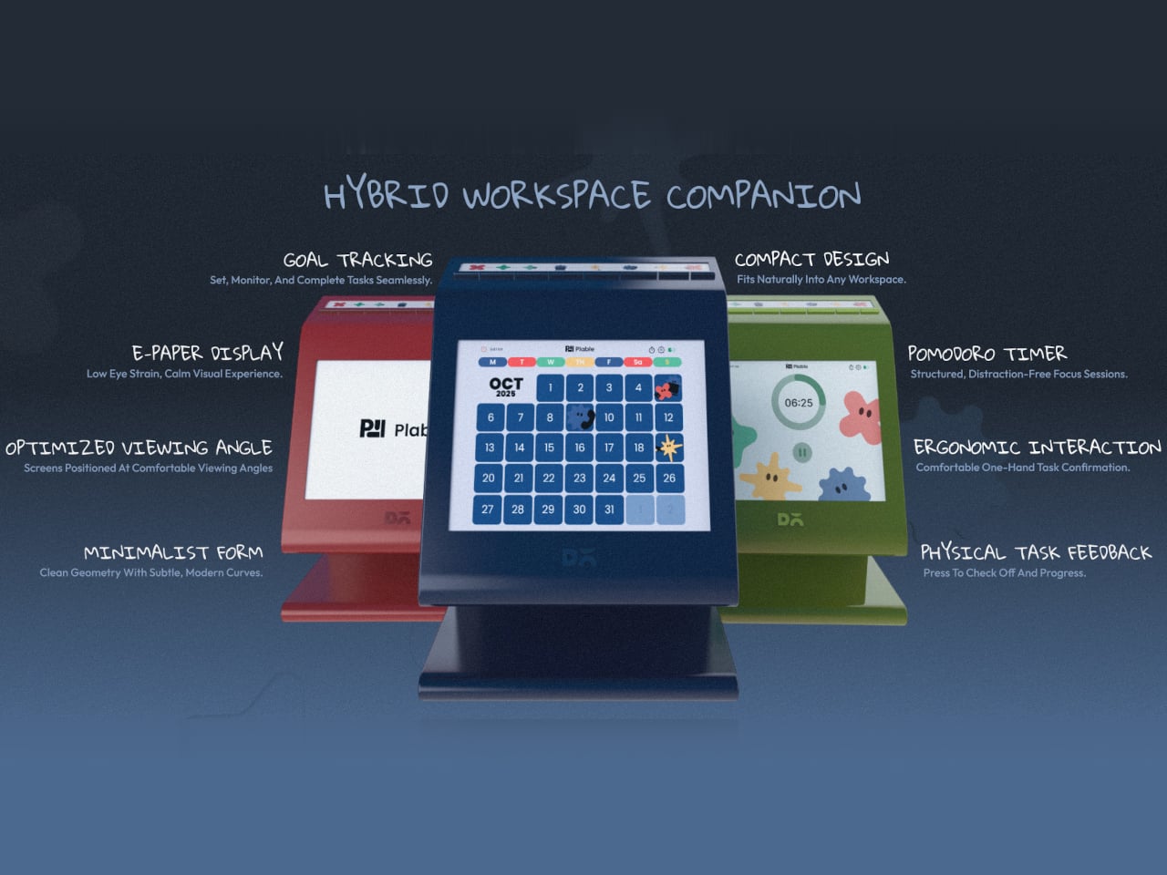 Plable is a hybrid workspace companion concept that tries to break that cycle by pulling tasks off the phone and onto the desk. Built around the tagline “Productivity meets playful rhythm,” it’s a small physical device that works alongside a companion app to create a calmer, more intentional workflow, one that builds focus through touch, rhythm, and gentle feedback instead of another notification.