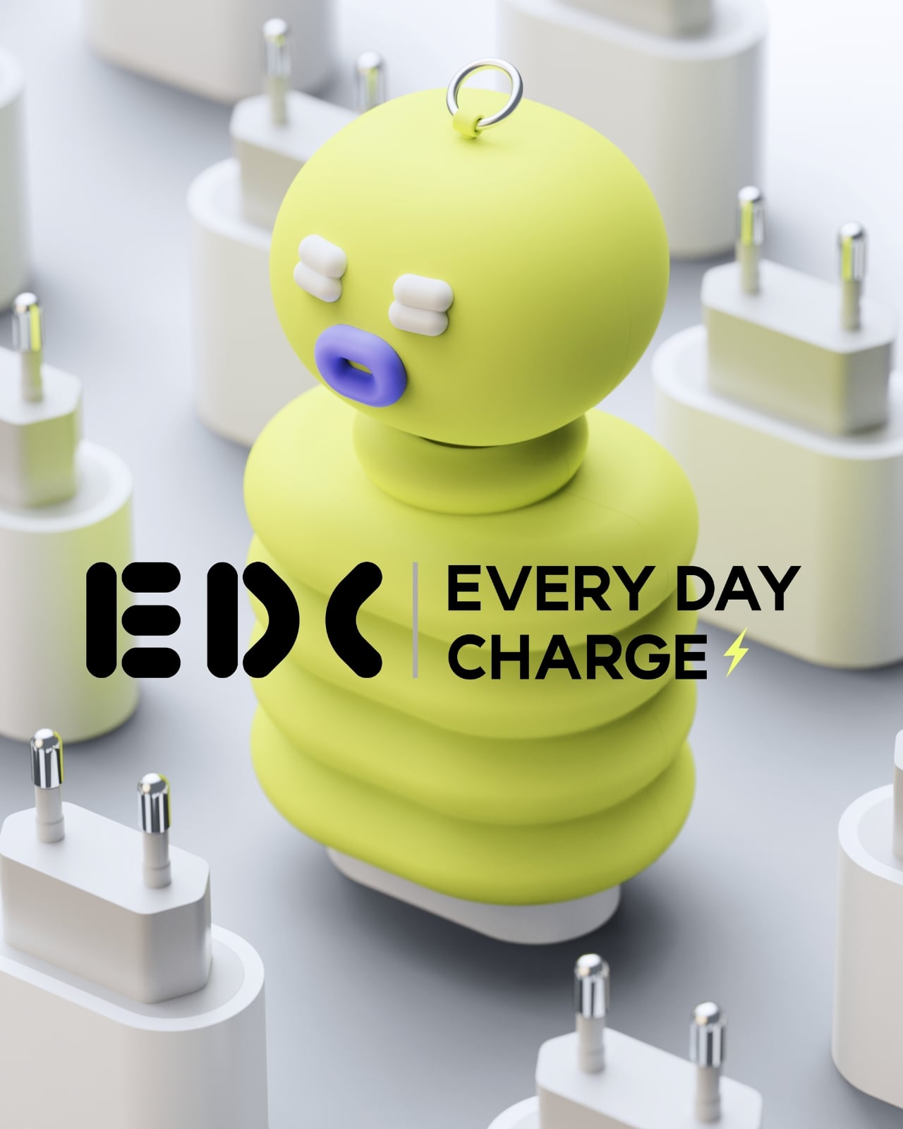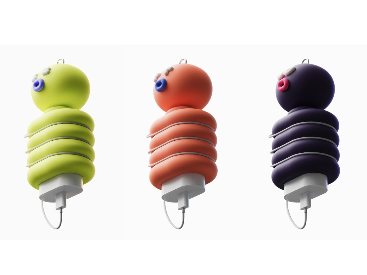 That said, Kwon didn’t just design a portable charger and call it done. The proposal imagines one that looks like a tiny creature you’d want to clip to your bag and take everywhere. The EDC charger concept takes the form of a small caterpillar-like character: a round, bulbous head with sleepy eyes and a little round mouth, perched on top of a segmented body made of plump stacked rings.