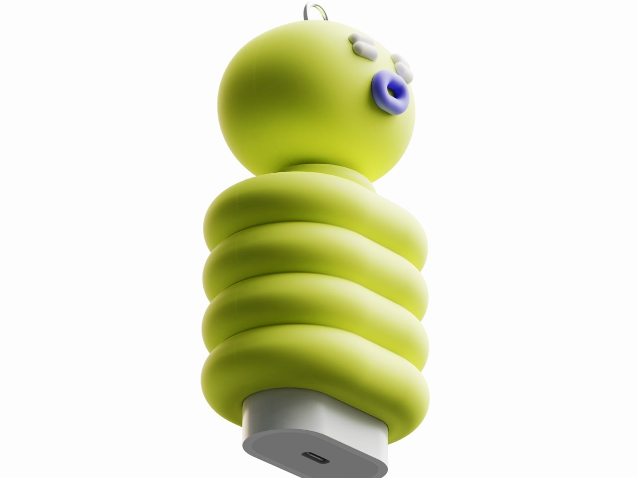 There’s a metal loop at the top so it can hang from a bag or keychain, and the cable wraps neatly around those body segments when not in use. The USB-C port sits at the base, tucked cleanly under the soft silicone form. It’s part functional device, part desktop toy, part bag charm, and it somehow makes all of that feel intentional rather than gimmicky.