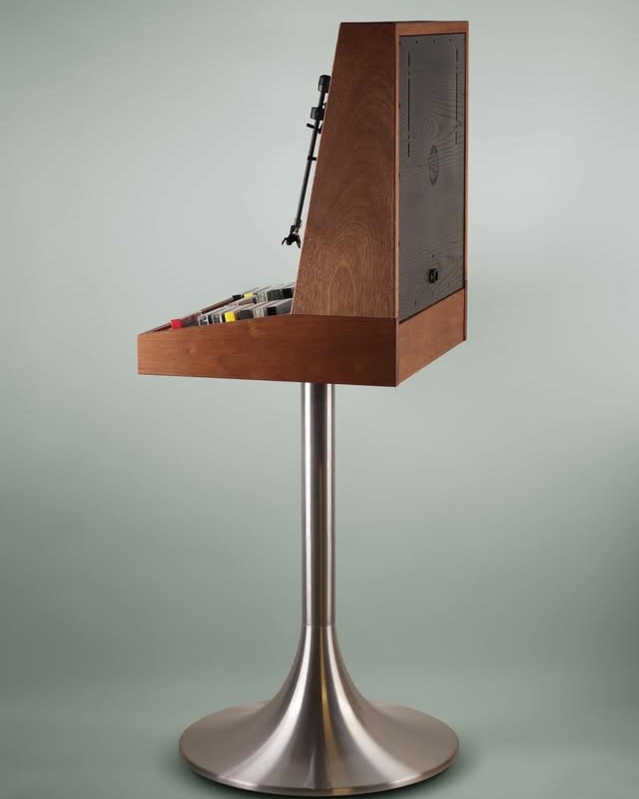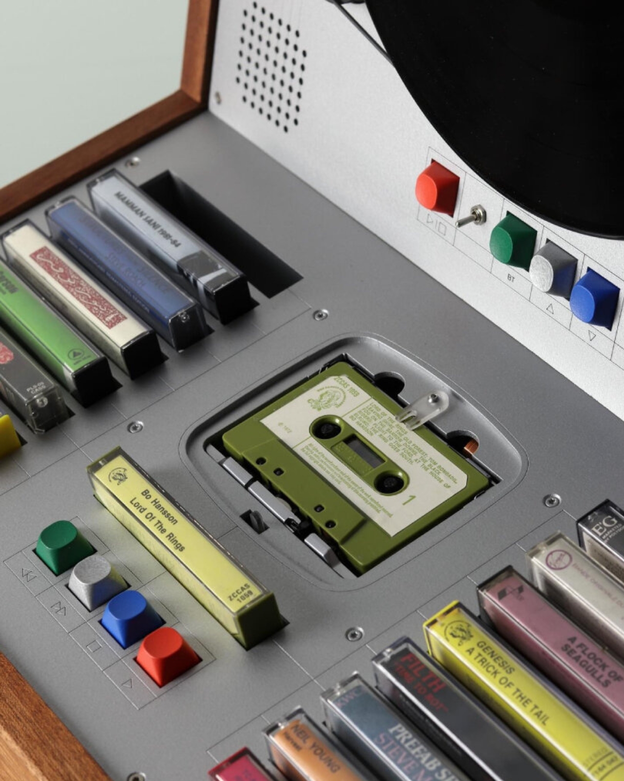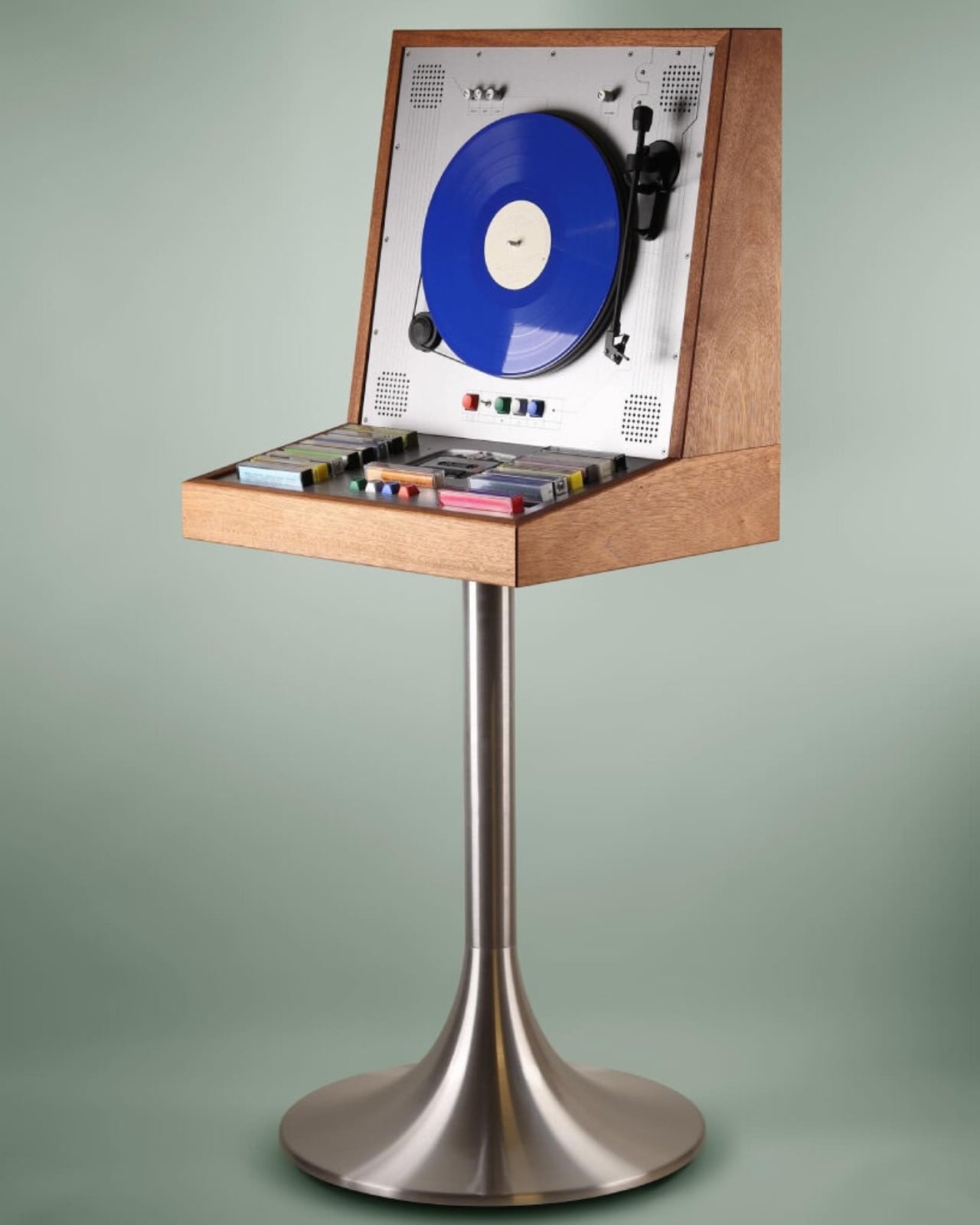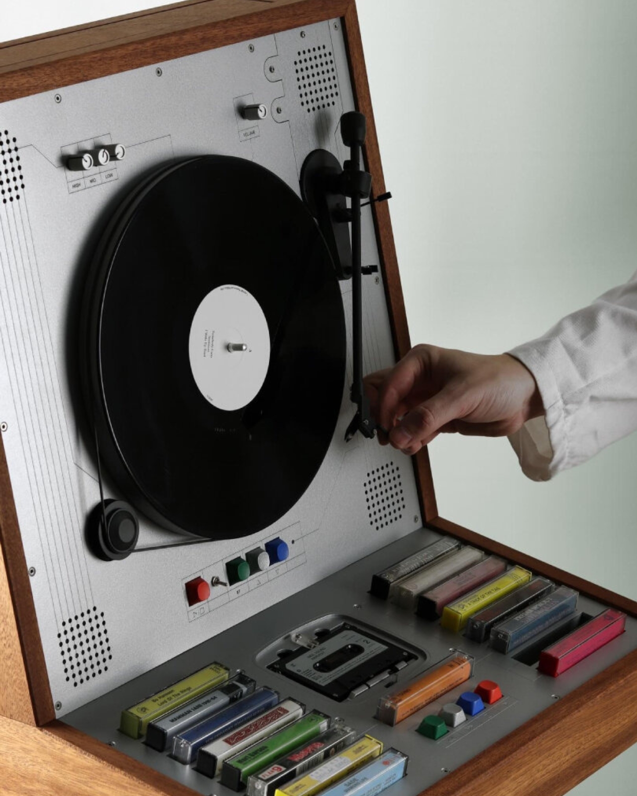 Below the turntable, the cabinet opens up into storage for cassette tapes, with several colorful ones arranged neatly in rows, also stacked vertically to mirror the record player above. The storage section holds up to 12 records. The whole layout feels like Hultén thought carefully about the ritual of listening, giving both formats their own dedicated space without either one feeling like an afterthought.