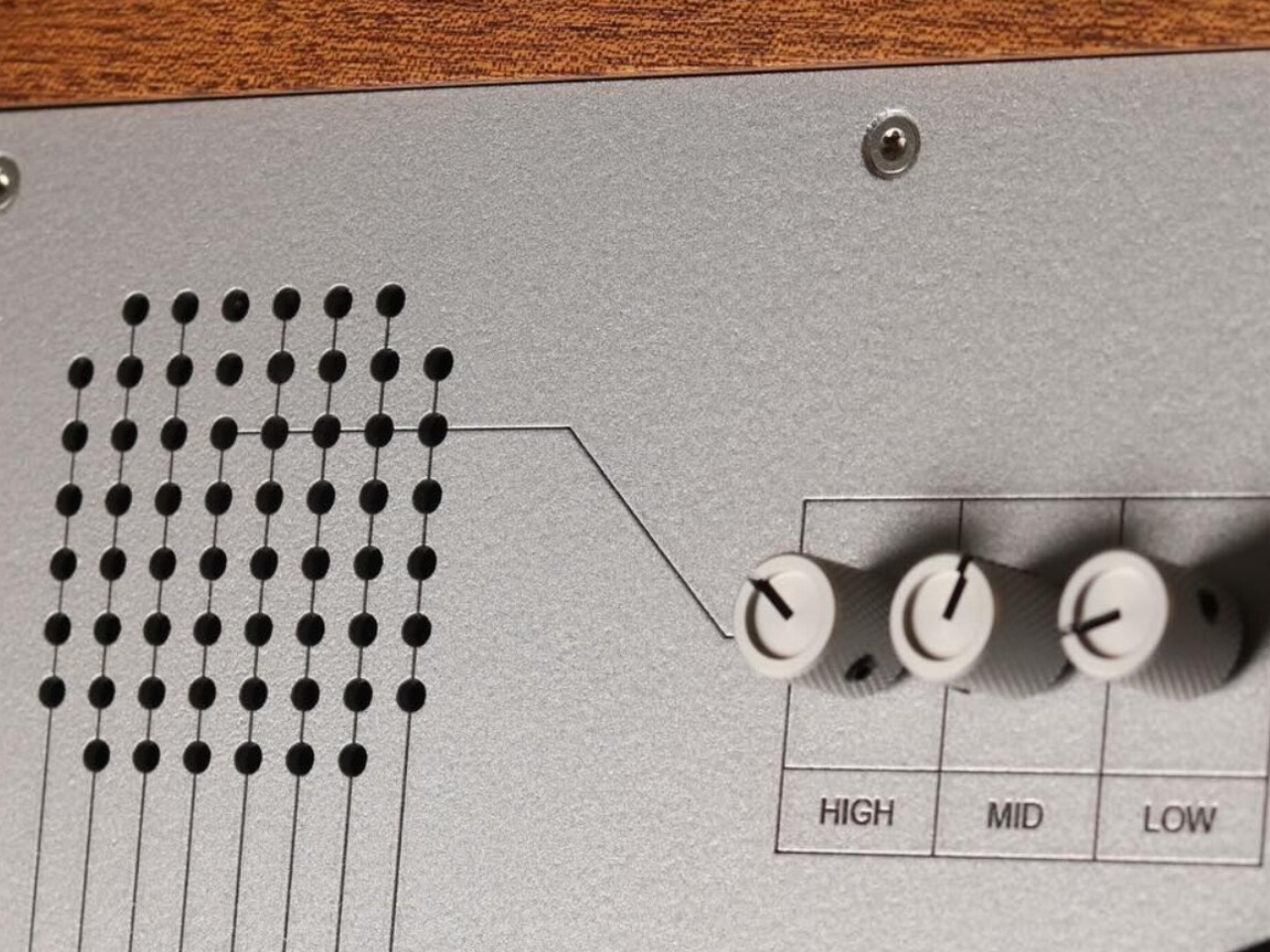Sound control comes through a row of small, round knobs at the top of the panel, each one labeled for high, mid, and low. Flanking them on both sides are speaker holes arranged in a clean grid pattern, the kind of detail that feels satisfyingly considered. Nothing is there by accident. Everything has a place.